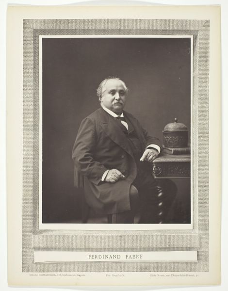 Curator: This albumen print, "Portret van een zittende man, aangeduid als Van Opstal," attributed to P. Weijnen & Fils and likely created between 1876 and 1878, captures a moment of poised contemplation. Editor: He seems self-assured, perhaps even a little stern. The subdued tones create a very stately, old-world feel. He looks like someone of significance, and a hint of sadness emanates. Curator: Albumen prints like this became popular as a way to produce portraits quickly and affordably, and made portraits accessible to the middle class. Examining studio practices, it’s a snapshot of evolving social norms surrounding representation. Editor: That’s fascinating, because the details really speak. Note his relaxed posture, the placement of his hands, a bow tie, all carefully considered symbols of status. Even his mustache reads a kind of Victorian authority, a signifier of that era. Curator: And consider the purpose of images like this—intended for public display, family albums. The circulation of such images played a part in solidifying and communicating those norms and ideals within Belgian society. Photography was very influential. Editor: Absolutely. A photograph such as this would cement the family's name, the man’s status, and then serve as a constant reminder to future generations of this carefully constructed identity. The bow tie and crossed arms suggest a composed power that resonated, at the time, for masculinity and civility. Curator: It’s interesting how what appears to be a simple portrait becomes an index of shifting power structures and visual cultures of the late 19th century. This object has clearly acted as an important emblem for the sitter’s identity and his community values. Editor: It truly does. It really highlights how much an image, especially a portrait, could stand for a family's status, morals, and even hopes for the future.
