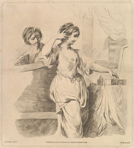Curator: This is John Singer Sargent's "The Parting of Jonathan and David." Look at how much is conveyed with so few lines. It almost feels as if he's captured a fading memory. Editor: It has a dreamlike quality, a classical depiction of male love rendered in ghostly grays. There's something incredibly poignant about the vulnerability it evokes. Curator: Sargent really focuses on the emotional intensity of the biblical story. It feels like a dance, or perhaps a silent scream—so operatic! Editor: Their clasped hands reaching skyward suggest a shared burden and aspiration beyond earthly constraints. But also a potential power dynamic? Curator: Perhaps... but maybe it simply captures that bittersweet moment when friendship confronts destiny. What a beautiful exploration of intimacy and sacrifice. Editor: Indeed. Sargent makes us consider how political and personal can be intertwined, even in biblical narratives. A somber reflection, truly.