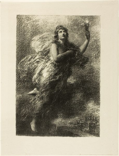 Editor: We’re looking at "Psyche," a print, likely an etching or wood-engraving from the 19th century, by William B. Closson, at the Minneapolis Institute of Art. There’s something ethereal about it…a hazy dreaminess to the composition. How do you interpret this work based on what you see? Curator: Indeed, the rendering cultivates that effect. Consider first the use of line – observe the artist's masterful modulation. Note the density and directionality defining form and suggesting movement. The delicate network of hatched lines both constructs and deconstructs the figure, simultaneously present and dissolving. The use of monochromatic values— the scale ranges narrowly across grey—evokes depth and three-dimensionality, as much as an emotive ambiance. Editor: So the emphasis is more on how the lines are used to build an atmosphere, rather than any story it might be telling? Curator: Precisely. The visual vocabulary employed directs our attention inward, away from representational narrative toward the poetics of form itself. Do you notice any geometric underpinning for the arrangement of line and shape? Where does your eye travel, and why? Editor: It’s like a spiral almost, around her face and then outwards. I hadn't noticed that before! The face is certainly the darkest region, and most sharply in focus, drawing your gaze directly there, and her outstretched arm helps pull the focus along, doesn't it? Curator: A valuable insight! The spiraling motion is intrinsic to understanding the overall effect. It shows that the essence of the work resides in the aesthetic experience, not a literal one. Editor: I guess I was so caught up in the sort of Romantic feel that I missed that more structural element! Thanks for showing me that. Curator: The experience reveals how a closer look can illuminate the artist's technical skills.
