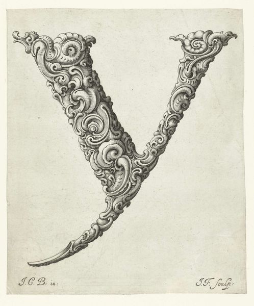 Editor: This is "Letter S," a baroque print by Jeremias Falck, dating back to the mid-17th century. The intricate swirls and flourishes forming the letter are really striking, but also a bit overwhelming. How do you interpret this work? Curator: The "S," so fundamental to language, is here transformed into a visual spectacle. Think of it less as a mere letter and more as a vessel overflowing with cultural memory. Consider the Baroque period: this was an era of drama, ornate detail, and powerful symbolism, a period where even something as simple as a letter was used as an expression of wealth and influence. The swirls and curves – what do they remind you of? Editor: Hmm, maybe foliage, or… waves? Curator: Exactly! And what might foliage and waves, rendered with such deliberate complexity, represent? They become symbols, laden with associations of growth, nature's abundance, even the power and unpredictability of the sea. The "S," therefore, could subtly allude to the flourishing trade routes that shaped the Baroque world. The letter then becomes a symbol that unlocks trade, power and knowledge. What are your thoughts? Editor: That’s fascinating. I was initially just taken by the ornate design, but now I see how much deeper the meaning goes. It’s like the artist is embedding entire worlds within the lines of a single letter. Curator: Precisely! It reveals how seemingly simple forms can become potent containers of cultural and psychological weight, echoing through the ages.