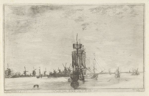 Editor: This is Susanna Duncombe's "Coastal Scene with Three Sailing Boats at Anchor." It looks like a quick sketch, almost dreamlike. What kind of visual language do you see being used here? Curator: The boats, particularly their sails, invoke a longing for passage, for journeys undertaken and possibilities realized. They also represent trade and communication, a crucial link between cultures. How does the water itself speak to you? Editor: It seems calm, reflective. Curator: Precisely. Water often symbolizes the unconscious, the depths of emotion and intuition. Duncombe uses it to mirror not just the boats, but perhaps a deeper sense of introspection. I wonder about the figures on the shore, too? Editor: Maybe they represent our connection to the scene, like we're observing this from the shore ourselves. Curator: Indeed. It’s a visual bridge, connecting us to the past, to the artist's perspective, and to our own interpretations. Thank you!