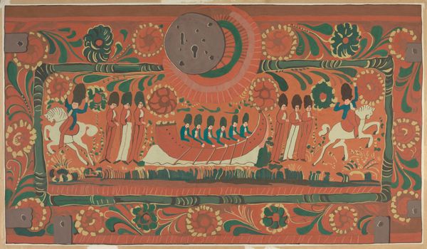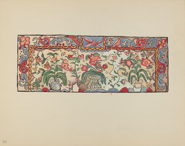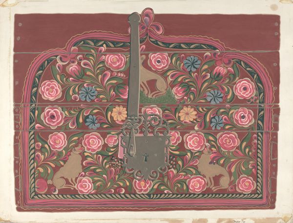 Curator: Immediately, what strikes me is the folksy, almost fairytale-like quality it exudes. There's something very endearing about the narrative captured within those borders. Editor: Indeed. We're looking at "Chest," a work painted circa 1938 by Margery Parish. It's a watercolor drawing and painting depicting, well, precisely what it says: a chest. Curator: And it seems to represent far more than mere utility, wouldn't you say? Notice the emphasis placed on decorative elements and the narrative scene of figures fleeing? This draws the eye in! I am also drawn in by the limited use of colour that seems so deliberate. Editor: I agree! Consider the implications. A handmade, hand-painted chest situates itself firmly within a tradition of craft often marginalized by fine art establishments. The choice of watercolor and a muted color palette—observe the careful watercolor bleeds—suggests an intentional engagement with the history of domestic art making. We must consider then how labor intersects with Parish’s aesthetic choices. Curator: Absolutely! This could also suggest issues related to folk-art—often associated with women—its place in exhibitions or the market. But doesn’t that narrative also invoke something deeper? This isn't mere decoration; it reflects anxieties tied to gender and protection. The image implies flight; a female figure, perhaps evading pursuit… what story is that chest safeguarding? Editor: Precisely! The chest then operates on a multilayered symbolic plane, negotiating societal anxieties surrounding gender, vulnerability, and narrative traditions. Think about it in light of the political landscape in 1938: growing anxieties of an oncoming war! Could this art hold hidden narratives, maybe alluding to themes of escape, or perseverance, as seen by a woman in her unique intersectional experience of her time. The floral borders contrast sharply with the urgent narrative inside and yet contain the energy. Curator: Such a fascinating interplay, a tension brought on with those deliberately muted watercolours— and how Parish turns material constraints into powerful means for visual story-telling! Editor: Agreed! It reminds me again of the necessity of broadening traditional readings to accommodate diverse and nuanced perspectives, emphasizing identities and histories we thought we knew.