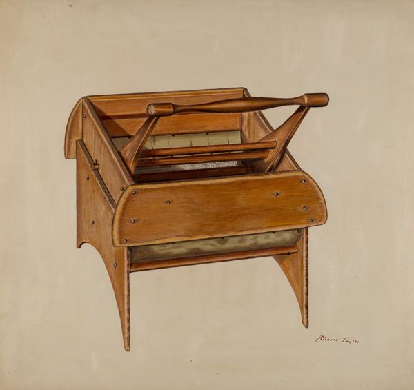 Editor: Here we have George Loughridge's "Roll-Top Desk," created around 1953, rendered in watercolor and drawing. The details feel so precise. What strikes me is the way it idealizes a space of work and perhaps domestic life...What do you see in this piece from a historical perspective? Curator: It's interesting you say idealizes. This piece resonates with the post-World War II period when there was an enormous desire for order and efficiency in both home and work spaces. But consider the desk itself; it's presented almost devoid of context. There is no indication who might own it. Editor: That's a great point. It really is just the desk itself. Is it the focus on consumer goods starting to be emphasized at the time? Curator: Precisely! Loughridge might be depicting the aspiration, but perhaps also commenting on the increasing commodification of even our most intimate spaces. Consider how advertising at this time began focusing not just on needs, but on desires, on the performative aspect of possessions. Are we looking at an item, or a symbol of something else? Editor: So, this rendering might be hinting at the way domestic spaces were becoming stages for a sort of performance? Like you purchase a lifestyle in buying the desk? Curator: Exactly. The clean lines and organized compartments speak to this need for control and efficiency that might be less about function, and more about presenting an image of success. Think about how furniture design influences social behavior and identity during this time. Do you feel like that helps broaden your understanding of the piece? Editor: Absolutely. It shifts my thinking from purely aesthetic appreciation to thinking about how culture influences both art and our own self-perception through objects. Curator: And hopefully helps reveal how art is a mirror reflecting not just an object, but society itself.