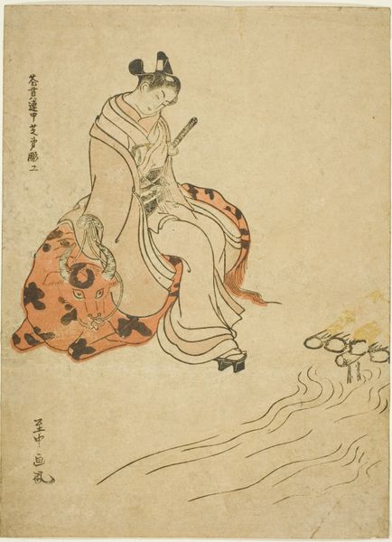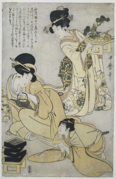 Curator: What a deliciously eerie feeling! Is this one of Toyokuni I’s prints? Editor: It is indeed. It's an early 19th-century woodblock print called "The actor Onoe Shoroku I as the ghost of the Shirabyoshi Hanako standing over Osagawa Shichizo II as Tsumagi..." quite a mouthful, isn't it? The actors are performing in "Uruo-ogi Sumizome no Sakura." Curator: Just the title hints at so much narrative! And the ghost hovering, that spectral quality... you can almost hear the whispers and feel the chill. Editor: Ghosts in Japanese art represent unresolved emotional conflict, right? You have the kneeling servant and the haunting ghost figure standing over her, an elegant yet frightening presence... Curator: The kimonos! I love how the fabric designs practically tell their own stories, the trailing, curving shapes like emotional tendrils. Editor: Well, kimonos act as social texts, a set of iconographic prompts, marking everything from marital status to season. What looks like pattern, in the hands of an expert artist, reads like text. And you can also tell a lot from a pose. It seems the ghost towers above the kneeling servant in a way that shows clear social difference... It really evokes something so sad and full of longing. It has a weight to it. Curator: Exactly! I think it comes from the ghost gazing down with such regret, yet a sinister glare, combined with the figure's transparent robes—it speaks of so much loss. And then there’s the way Toyokuni’s use of line and block creates such different textures for each character… a feast for the eyes. Editor: I was immediately drawn to the theatrical and slightly surreal staging. It brings forth an amazing psychological insight to social disparity by the actors performing a scene layered with memory and desire. And that hint of pink amidst the spectral grays, such lovely touch! It evokes the temporal bloom, perhaps the promise that is yet to pass… Curator: Ultimately, it is a sublime mix of haunting beauty and deep unease, isn't it? I will definitely keep an eye out for more pieces of his work going forward.