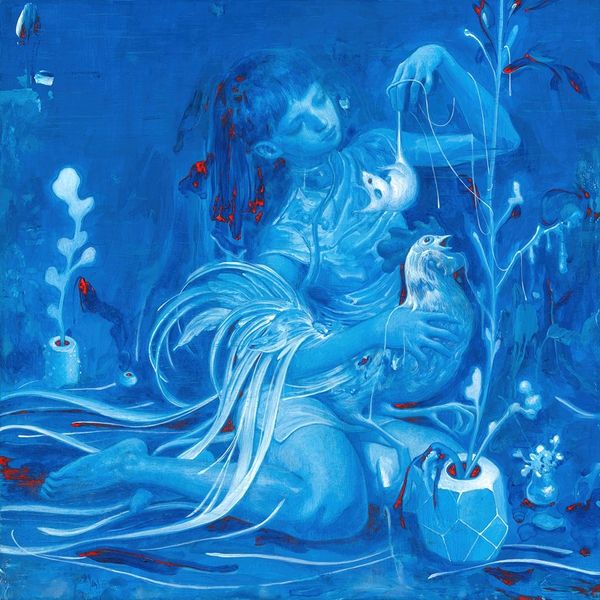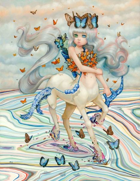 Curator: Daria Theodora is the artist behind this fascinating watercolor titled "Our Time Together." Editor: My initial reaction is captivated by the fluid application of the watercolor and the stark contrast between the woman’s demure pose and the somewhat chaotic scene around her. The single, very bright red shoe commands your attention instantly. Curator: Indeed, and that contrast seems so deliberate. The soft pinks of her skin and hair, juxtaposed with those tendril-like dark blue forms and scattered blossoms, bring to mind myths about sea nymphs or water spirits—entities of great power camouflaged within fragile beauty. Editor: Speaking of which, let's consider the materiality here. The choice of watercolor, traditionally a medium known for its ethereal quality, feels key. It’s about transience, control and lack thereof—washes of color merging in unplanned ways, mirroring how the character’s control over her circumstances perhaps slipping, emphasized by the gold meandering seemingly randomly over her body. Curator: Yes, I completely agree. Gold acts here as a symbol. Note how it traces what appears to be liquid trails. I believe the artist uses it to represent a preciousness, but maybe also the fluidity of memories. The work resonates with echoes of Klimt’s gold ornamentation—a sign of divine femininity or fertility—but employed here in a rather contemporary and subtle manner. Editor: You know, and it’s interesting to observe that gold leaf, even as it's applied, creates very thin but visually prominent relief. So, it simultaneously enhances the flatness of the paper surface even while also creating a more active viewing experience of light and shadow for the viewer. It feels really thoughtful! Curator: Absolutely. The flowers interspersed throughout the image could easily stand in as symbols of longing, beauty, or lost love depending on the tradition you study. Editor: Ultimately, what strikes me is how the material choices work hand in hand with these loaded symbols. The ethereal nature of watercolor coupled with the preciousness of the gold is interesting and the way they were consciously labored to bring to bear the beauty of both, gives “Our Time Together” a lasting effect. Curator: It is the emotional layering within "Our Time Together"—how Theodora intertwines these classical visual tropes—that makes it so memorable and unique for the viewer, to reflect perhaps about their own relationships to fantasy and desire.