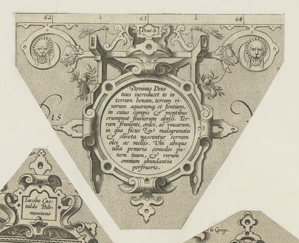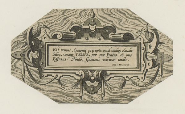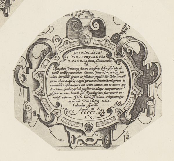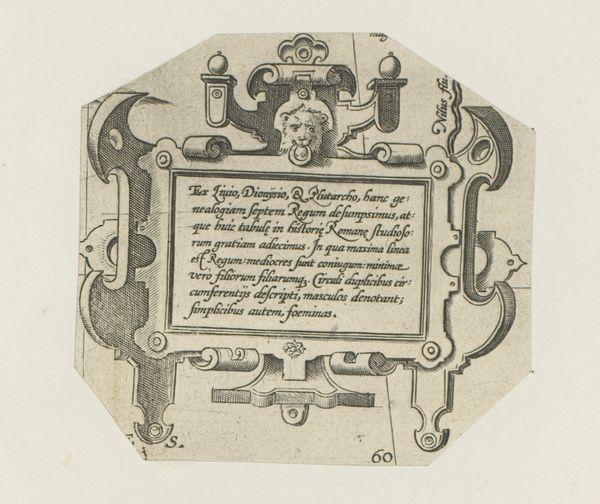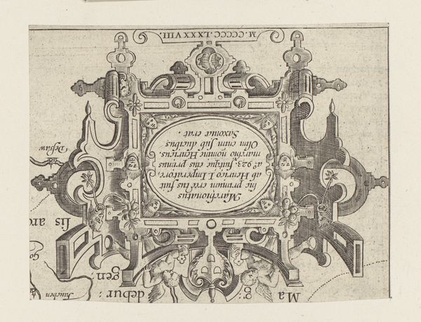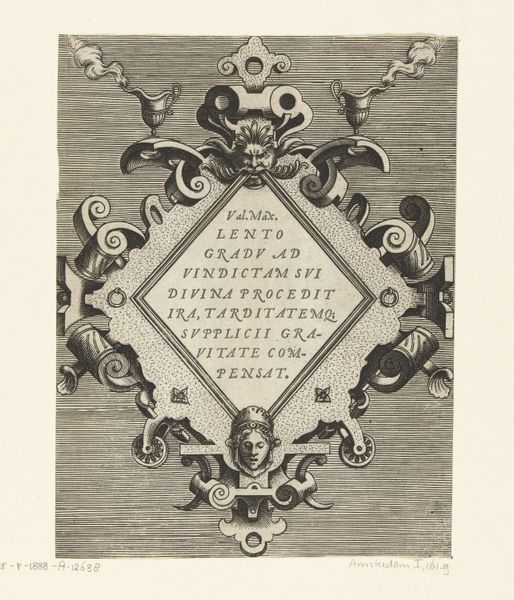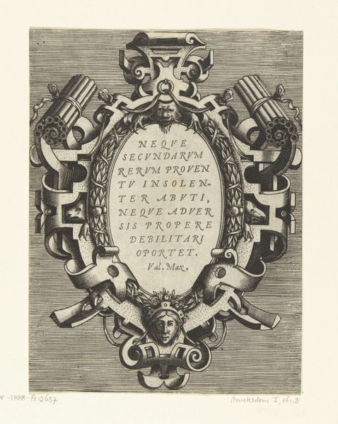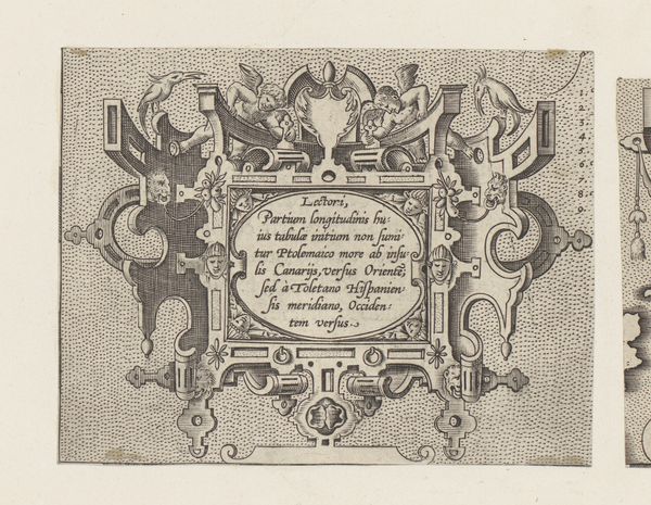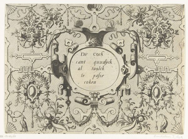 This cartouche with birds and vase, created by an anonymous artist, employs a printmaking process to render its intricate design. Note the contrast between the dark lines and the light background, achieved through careful etching or engraving on a metal plate. The design features a symmetrical arrangement of scrolling foliage, stylized birds, and a central oval cartouche filled with text. This use of ornamentation and symbolic imagery, while common in the decorative arts, also carried broader social significance, reflecting the values and aspirations of the elite patrons who commissioned and consumed such works. Consider the labour involved in producing such an artwork. While the printmaking process allowed for reproduction, each impression still required careful execution. The materials, while not precious, demanded skill and precision to manipulate, reflecting the knowledge and expertise of the artisans involved in their creation. In appreciating this cartouche, we recognize the intricate connection between materials, making, and social context, blurring traditional distinctions between fine art and craft.