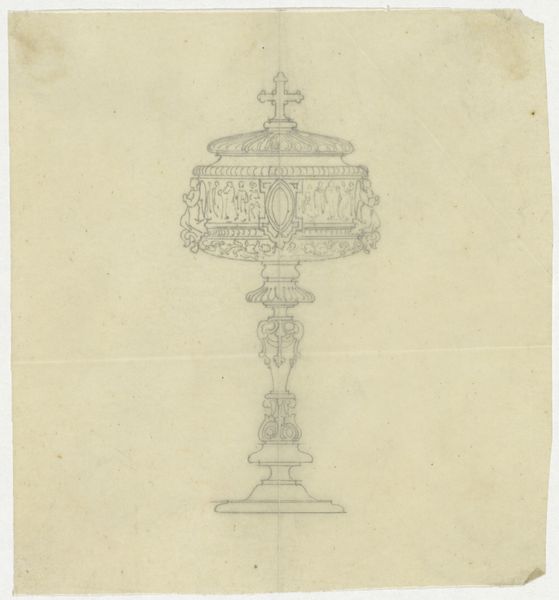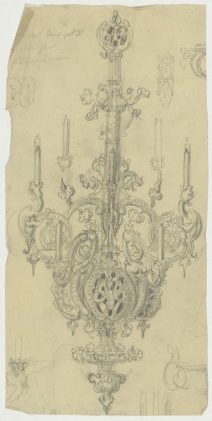 Curator: Look at this—Medaillon, dating roughly from 1830 to 1850, crafted by Firma Feuchère. It's a pencil and ink sketch on toned paper, a design bursting with ornate details. What's your initial take? Editor: Exquisite! It has a fragile beauty. All those fine lines suggesting a grand object—almost like capturing a fleeting thought on paper. Makes me wonder what object was in mind here. Curator: Indeed. There is such detail despite its sketch-like quality. Feuchère was a notable firm producing ornamental designs, catering to the tastes of a society enamored with opulence. These designs, although on paper, informed objects designed for elite consumption and cultural performance. Editor: Absolutely! I notice those cherubs perched atop and the little romantic vignette in the medallion's centre, and a crown right above it all—it gives a sense of playful power and light-hearted sophistication. I’d imagine it on a jewelry box, or as part of furniture. Something for a very fancy lady, perhaps? Curator: It's possible! Think about how these images functioned. This firm circulated designs like this, feeding a market for luxury goods that reinforced social hierarchies and, frankly, gendered expectations. The image itself participates in that theatre. Editor: That is really insightful. It does beg the question, though: Did they understand they were reinforcing or reflecting? Because when I look, I also imagine someone playfully just doodling the most complex and impractical design they could conjure, pushing against rules and boundaries. It has a touch of rebellion there! Curator: Perhaps both! Cultural productions rarely offer one simple answer, right? The market pushes towards replication, but also rewards the allure of a certain creativity or invention. Editor: Well, looking at the little stains, the uneven edges of the paper... it definitely speaks of creative chaos, or at least of experimentation. It shows it was a thought caught on the run, not a careful design for mass-manufacture. A one-off moment that history now allows us to appreciate. Curator: Precisely! A fleeting, beautiful thought preserved. It helps us consider the conditions from which objects are borne and to what end! Editor: Absolutely. A beautiful glimpse behind the curtain.