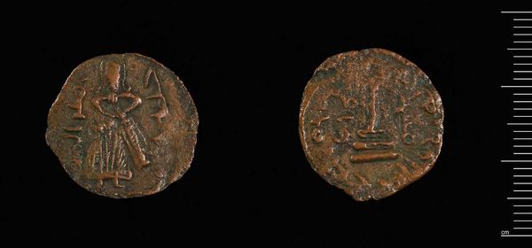 Curator: Here we have a fascinating artifact, a Coin of Herakleios, crafted under Abd-al-Malik of the Umayyad Caliphate. Editor: The worn copper has a somber, antiquated beauty. Its patina tells a story of circulation and age. Curator: Indeed. This coin's imagery provides a visual dialogue between Byzantine and early Islamic cultures. Note the initial Byzantine iconography subtly adapted to reflect Umayyad power. Editor: The layering of cultural symbols is intriguing. The coin served as a political tool, subtly legitimizing the new rulers. Curator: The materiality speaks to power. The coin's small size belies its vast economic and political influence. Editor: Reflecting upon its visual language, I am struck by how currency can be a powerful symbolic tool. Curator: Precisely. This piece elegantly encapsulates a critical period of transition and adaptation.