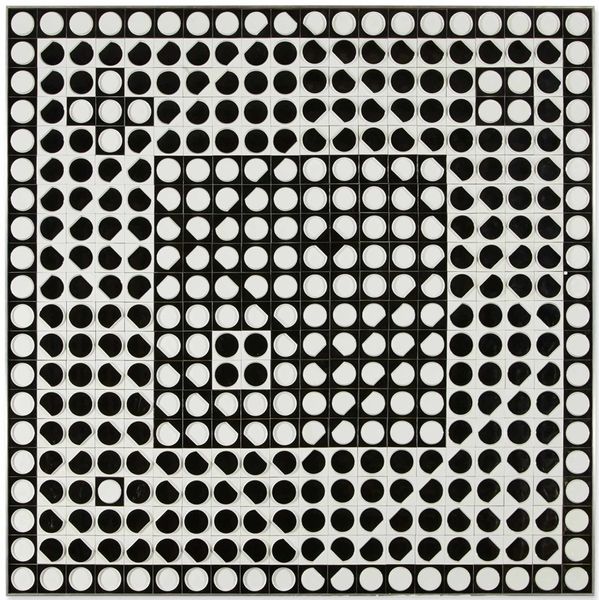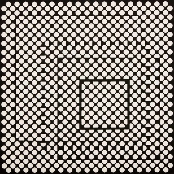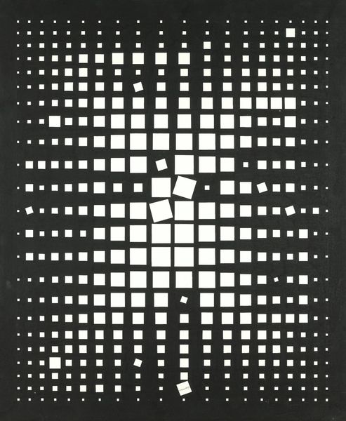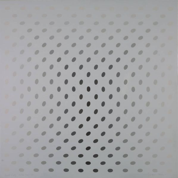 Curator: This is Bridget Riley's "Pause," an acrylic on canvas work from 1964. Editor: My first impression? It's incredibly disorienting. It's like the ground is giving way beneath your feet, or the air is shimmering intensely from the heat. There is definitely a sensation of movement. Curator: Exactly. Riley is known for her Op Art, short for Optical Art, which utilizes geometric patterns to create visual illusions. She played with perception in a way that challenged established artistic conventions. This piece perfectly exemplifies that experimentation. Editor: Absolutely. The strategic use of black, white, and gradations of grey to structure this dotted grid pattern almost tricks the eye. It almost seems that the grid subtly bends inwards on the right. One cannot help but associate the circle with themes of wholeness, cycles, or the all-seeing eye of divinity or control. It’s almost overwhelming. Curator: It's fascinating to consider Riley’s intentions at the time. The 1960s were marked by profound social and political changes. The art world was not unaffected and experimented with this desire for perceptual shifts. How might "Pause," as a work of abstraction, engage with that period of great tension and change? Editor: I see that reflected. The illusion could perhaps be seen to reflect our collective need to find pause and stillness amidst overwhelming stimulation and noise. Curator: A radical and bold notion when you consider it, especially against the backdrop of conventional painting. It essentially rejects representation in favor of pure sensory experience. And by calling it "Pause," she is subtly prompting the viewer to slow down, to consider perception, almost like a form of protest in a society on the verge of enormous transformation. Editor: And it seems like a very poignant message today. It reminds us of the power of symbols, abstraction, and repetitive figures in providing meaning. Curator: Agreed. Riley's exploration of visual perception through simple forms reveals that art can go beyond representation, it can tap into the psychology of how we see. Editor: A timely insight for me too. Art isn’t simply about aesthetics, but a conversation about how visual experience, memory, and cultural continuity function and can change.