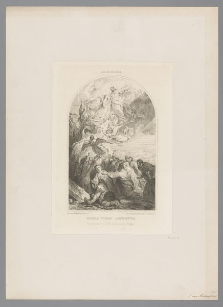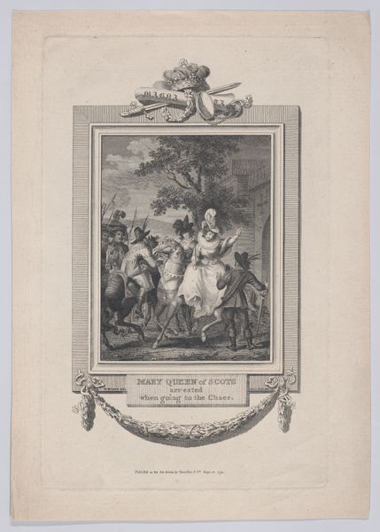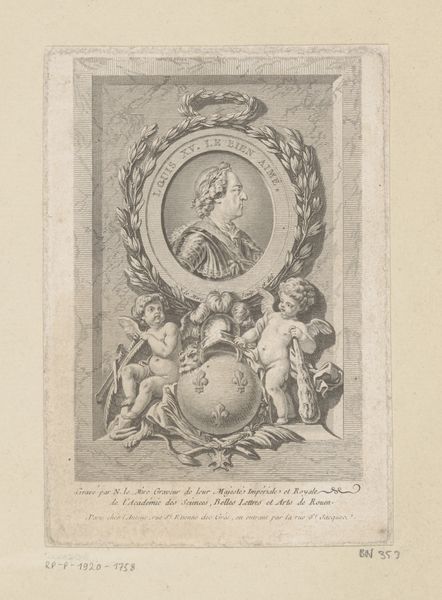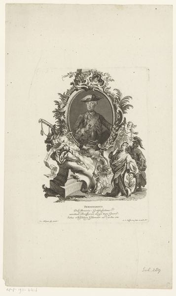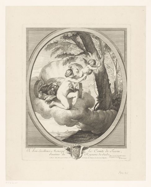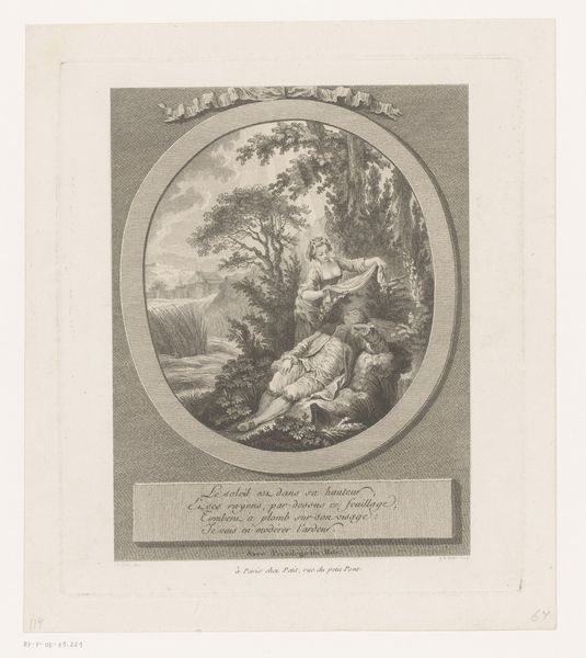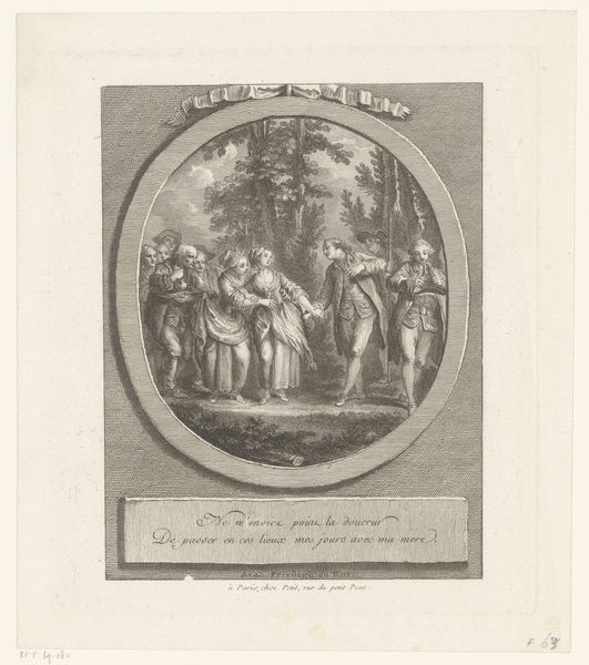 Curator: Here we have "Etend en drinkend gezelschap in een landschap," or "People eating and drinking in a landscape," created in 1768. It’s an engraving. Editor: My first thought is how much it captures a sense of leisure. It’s quite lovely, with this oval framing focusing on a jovial outdoor gathering. There's an easy harmony despite the detailed lines, although the landscape is rather idealised. Curator: Right, its visual language definitely evokes the baroque, but it also shows hints of a transition, perhaps leaning into sensibilities that would later flourish. The presence of the inscribed text, celebrating ease and companionship, frames this work, I think, within broader social contexts regarding class and privilege. What are your thoughts on that relationship in particular? Editor: It's definitely interesting when looking at imagery and the context of access to pleasure and leisurely activities during this period. While this gathering seems jovial, one wonders about the lives and labors that would have afforded such moments of escape and privilege to this community. It serves, unintentionally or not, as a reflection of the larger societal structures at the time. Curator: It’s interesting how the figures are arranged too, seemingly enjoying a moment of informal communion. And considering Pierre Adrien Le Beau, whose image is circulating here. It is hard to fully read intent, but in thinking about representation, power and seeing whose pleasure gets centered, what comes to mind for you? Editor: Well, you do bring up such great points on how leisure itself is portrayed, particularly with respect to different positions in that social tapestry. Overall, my take-away from it is that the historical role of the artist also reflects the society and politics around them, a relationship as symbiotic and often contradictory as any artistic creation. Curator: It certainly highlights art's intricate connections with historical, societal and power structures! Thanks for walking through it with me.