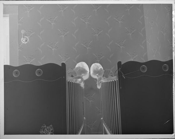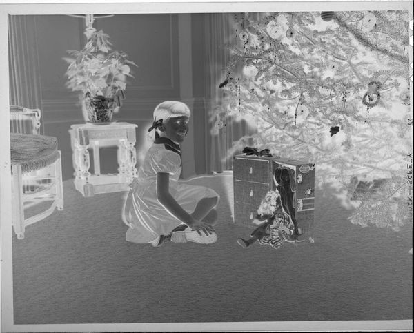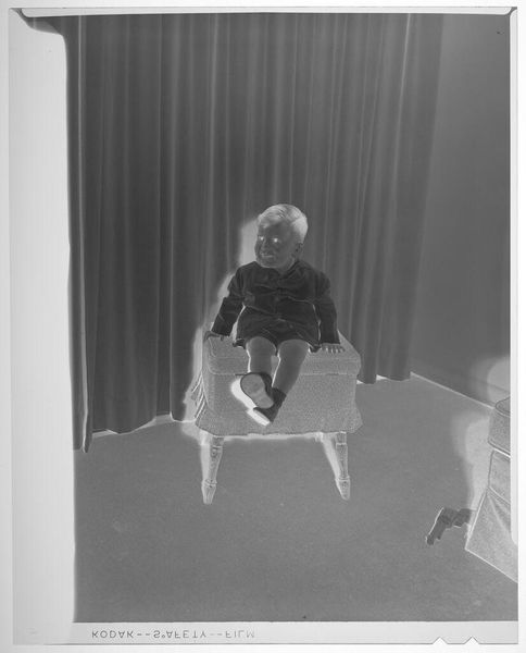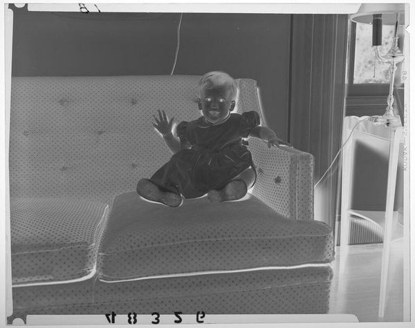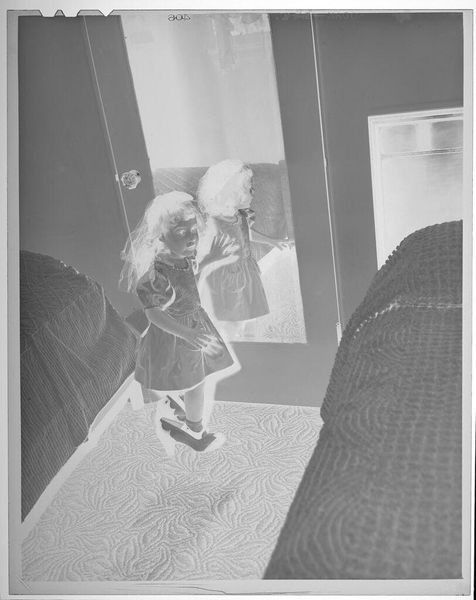 Curator: At Harvard Art Museums, we have an intriguing untitled image by Martin Schweig, depicting a young girl in a dress sitting with her wallet as her mother watches. The photograph measures about 5 by 4 inches. Editor: The composition strikes me as quite formal; the girl's posture and direct gaze create a strong focal point amid the ornate surroundings. It's a bit unsettling. Curator: Absolutely. The wallet, the dress, and the mother’s presence all point to a very staged, constructed reality. Consider the socio-economic context and the performance of childhood being captured. Editor: I'm intrigued by the use of light and shadow, which emphasizes the texture of the fabrics and the deliberate arrangement of elements within the frame. There is real drama in the stark tones. Curator: The materiality here—photographic film and its development—becomes a key element in understanding the image’s construction and the artist’s process in documenting social dynamics. Editor: It is a fascinating piece, bringing to the fore the tension between innocence and societal expectations. Curator: Indeed, a potent reminder of the complex layers within a seemingly simple snapshot.
