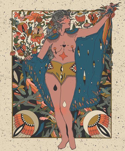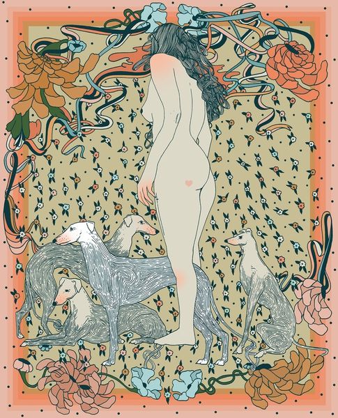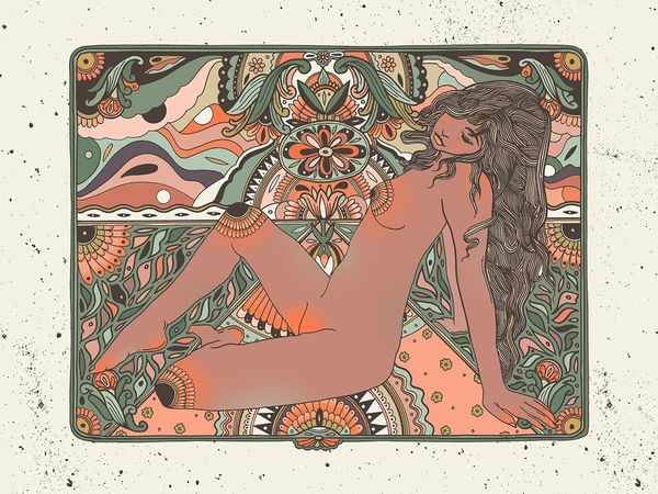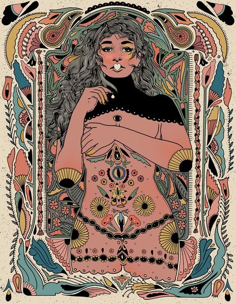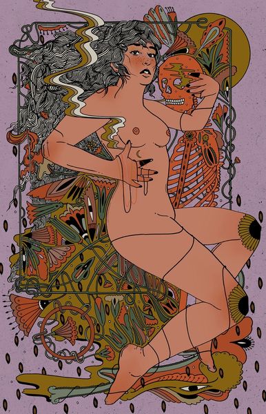 Editor: This mixed-media drawing titled "Cake" by Cassidy Rae Marietta features a figure amidst vibrant patterns. I’m struck by the way the body seems both present and obscured, almost dissolving into the background. How do you interpret this work? Curator: That’s a keen observation. I see this piece engaging with complex themes of identity and representation. The layering of patterns – floral, ethnic, almost psychedelic – pushes us to consider how identity is constructed and perceived, particularly for women. The body, especially the nude female form, has historically been a site of intense cultural and political struggle. Editor: So, the patterns are not just decorative? Curator: Exactly. They operate on several levels. Visually, they reference the Pattern and Decoration movement of the '70s, which challenged the dominance of minimalism and celebrated traditionally “feminine” crafts. But, more significantly, consider how these patterns – many with roots in Orientalism – might speak to cultural appropriation and the exoticization of the female body. Are we looking at a celebration or a critique? What does the artist’s choice to simultaneously reveal and conceal suggest to you? Editor: That's fascinating. I hadn't thought about the tension between celebrating beauty and questioning exploitation. The layering definitely adds to that ambiguity. Curator: Precisely. And that tension is crucial. Marietta invites us to actively engage with these complexities and question the visual languages we’ve inherited. Art becomes a vehicle for social commentary and intersectional discourse. Editor: It's made me rethink how patterns can be more than just pretty. There's so much history and power woven into them. Curator: Absolutely. And that's the power of art: to provoke those critical reflections and shift our perceptions.