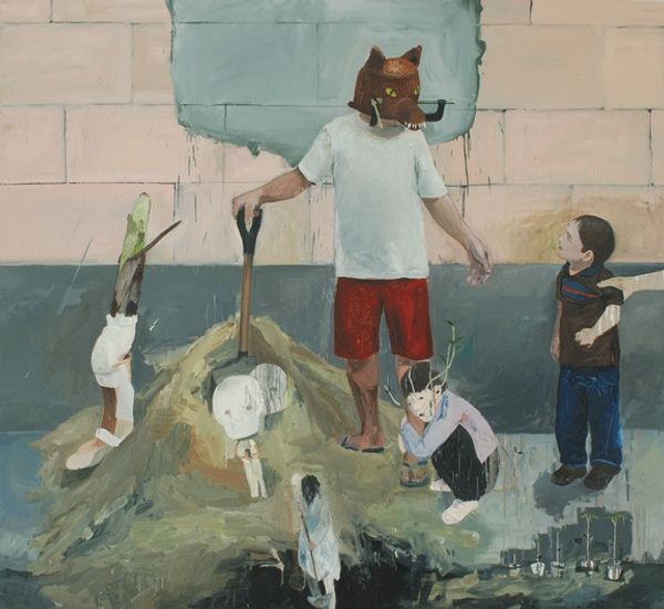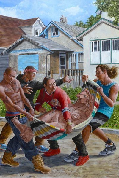 Curator: Adam Caldwell created "Border Crossing" in 2021. We're looking at an oil painting that very clearly reflects contemporary concerns around political polarisation and, I guess, a global pandemic. What are your immediate impressions? Editor: Honestly, it’s a chaotic snapshot, like a nightmare distilled into paint. The colors are saturated, the figures caught in a desperate flight, and the space itself feels oppressive. There’s almost a comical juxtaposition of dark realities played out in bright daylight. Curator: Right, let’s unpack the specifics. There's a family seemingly fleeing a space littered with torn Trump signs, and lurking in doorways are cartoon figures reminiscent of a disturbingly sinister Mickey Mouse. There is an obvious statement regarding the divisiveness caused by this political movement. Considering Caldwell’s other work, it aligns with his broader social critique through symbolism. Editor: The figures are what pull me in. They feel… raw. Not just physically but emotionally exposed, like their every instinct is screaming danger. I find myself connecting deeply with this fear even when I don't connect with everything it symbolizes. Curator: Interesting, yes—the choice of a familiar "Frozen" t-shirt on one of the fleeing figures provides further evidence for contemporary commentary. And if you look closely at the family unit—there are figures wearing masks which point further towards anxieties relating to public health... Editor: See, to me it feels so familiar. Those Trump signs underfoot. The sense of impending doom made comical with cartoon figures lurking, its oddly beautiful as well. It transcends pure polemic; there’s a tenderness towards those caught in its undertow. A raw sense of urgency to get the hell out, fast. Curator: Indeed. Caldwell manipulates familiar imagery and techniques to evoke a sense of unease about where society is going. There’s a narrative being built of where art can challenge ideologies and provoke discourse. What a powerful piece to consider. Editor: Precisely! And for me? It's also an incredibly haunting, visceral, and darkly comical reminder that in our chaotic world, it is okay to question everything we're taught.