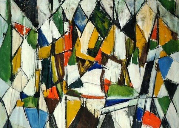 Editor: This is "Tramélia" by Amadeo de Souza-Cardoso, painted around 1914. It's an oil painting with striking geometric shapes and bold colors. It feels like looking at a disassembled machine. What do you make of it? Curator: This piece speaks volumes about the shift in early 20th-century art production. Look at the thick application of oil paint; it isn’t trying to hide its materiality. It's a key element. We should ask ourselves, what societal changes enabled Souza-Cardoso to use art production as a means to challenge what constitutes art itself? Editor: You mean, moving away from just representing reality? Curator: Exactly! Industrial advancements and new markets for art materials enabled a focus on abstraction and the act of painting itself. Before, artists often relied on patrons and specific commissions with stringent expectations. Now, cheaper materials and increased commercial opportunities granted freedom, leading to experiments like this. Look how he deliberately flattens the picture plane! It breaks the traditional role of painting, as well as showing off that oil-paint can also be just colors on a canvas, rather than creating 3-d reality on the 2-d canvas. Editor: So the availability of new materials directly impacted artistic expression? It's like the materials are doing more than enabling expression. Curator: Precisely! And the materials are also impacting consumption, no longer an expression of wealth through patronage, but the artist controlling their own fate, which leads to wider accessibility. "Tramélia" becomes more than just an image; it's a record of a changing relationship between the artist, their tools, and the societal structure that supports it. Editor: I never thought about it that way. It's fascinating how material conditions influenced such abstract art! Curator: It gives us a richer, grounded understanding. Focusing on the production lets us see art as an object embedded within its time, as the product of those socio-economical trends.