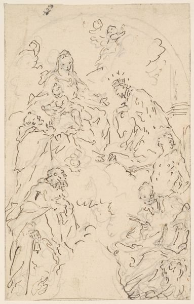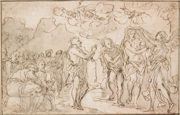 Curator: This drawing, “Johannes predigt in der Wüste,” by Jacques Callot, features pen and ink work on paper. It's part of the Städel Museum's collection, and offers a compelling glimpse into Callot's mastery of line and form. Editor: It's arresting. The stark contrast and the figures, especially John, emanate an intense energy. One immediately senses the dramatic moment, even before knowing the subject. There's a feeling of urgency in his gestures. Curator: Absolutely. If we look closely at the textures, especially the layering in the garments, we can see Callot’s understanding of light and shadow, building up forms with remarkably economic lines. Editor: And considering the historical context, the act of preaching, of dissenting voices rising in a landscape both literally and figuratively barren, resonates deeply. What might it have meant for Callot's contemporary audience to witness this representation of John's radical challenge to the established order? Curator: That's a great point. We know Callot was active during a time of significant religious and political upheaval in Europe. He trained in Italy, but his work circulated throughout Europe via printmaking—which broadened access, allowing this image and his other works to spark widespread debate on political reform. Editor: How might the materials themselves—the pen, the ink, the readily available paper—have affected Callot's artistic decisions? These aren't precious, monumental materials suggesting a monumental power. They suggest portability, transmission of ideas, dissemination...even resistance. Curator: Indeed. Ink, as a drawing material, is quick to make. Combined with printmaking technologies it amplifies a political argument—but that's a dangerous move in a society under tight authority! We can imagine those images moving illicitly from hand to hand and the role played by material factors like paper. Editor: And look at John's bare feet and tattered robe, versus the head coverings and draped fabrics on the people in the crowd with him! This juxtaposition highlights the class divisions, as John’s own intentional destitution prefigures the voluntary poverty espoused in various forms of Liberation Theologies. Curator: You've introduced some vital cultural and socioeconomic context into what might initially seem purely representational—shifting the view toward agency and the reception of those bold stances, thanks for sharing this interpretation. Editor: Thanks! It feels vital to acknowledge how artistic materials can intersect so powerfully with social justice!