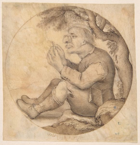 Curator: This engaging work, created between 1640 and 1660, is titled "Seated Old Man Facing Right, Singing and Holding Music," attributed to Anton Crussens. Editor: My first impression? It’s the dynamism created with such delicate linework. A sort of theatrical moment, caught in ink, with that face, somewhere between amusement and grotesque agony. Curator: Indeed. Let’s consider the social context. This piece emerged during a period of immense social upheaval across Europe, marked by the Thirty Years’ War. These images, reproduced through prints, would be available for different social classes and offered ways to explore shared humanity and also expose caricatures that could be harmful. The aged man, perhaps a minstrel or beggar, represents both a romanticism of the common man and an indictment of societal neglect. Editor: I see it also through the interplay of shadow and light, achieved purely through line. The concentration of lines define his profile and garment contrasting with the softer rendering of the background. It evokes an emotional resonance that transcends its physical medium. The circular composition, the limited value range...it is quite powerful. Curator: Precisely. Consider the historical reception; genre scenes depicting the lower classes were gaining traction, offering commentary on social stratifications. Does it mock, empathize, or simply observe? And for whom? The gaze of this character certainly feels challenging. Editor: I appreciate how the artist harnesses visual techniques like hatching to give shape and volume to the old man's figure. And the musical text is rendered so precisely, albeit illegibly—inviting viewers into this sonic moment. It's masterful control within simplicity. Curator: The work provides a window into how age, poverty, and artistic expression were viewed and circulated through visual culture. Editor: Ultimately, it's about form, and the capacity of this singular form to transcend time and continue its provocative humanness to this day.