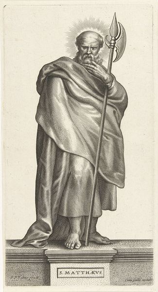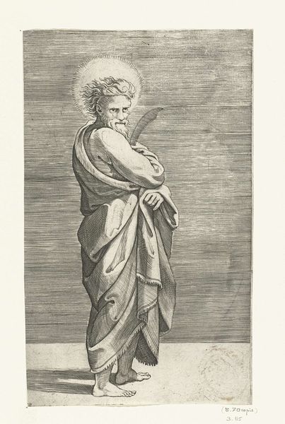 Editor: This is "Apostle Matthew with Purse," an engraving by Marco Dente dating from about 1517 to 1527. The figure has a certain calm, weighty presence, and the fine lines of the engraving are incredible. What do you see in this print? Curator: It’s fascinating how this print embodies the intersection of religious iconography and the developing role of art within society at the time. This work should be interpreted within the context of the Italian Renaissance’s interest in both classical forms and religious subjects. Dente's figure, while recognizably Saint Matthew through his symbolic purse, takes on a monumentality often seen in depictions of Roman senators or philosophers. Does this blend of religious and classical imagery suggest anything to you about the intended audience? Editor: I guess that only the privileged class could read it! Someone educated in classical history, perhaps, who also knew the bible? Curator: Precisely. Prints like these weren't simply devotional objects; they also circulated within humanist circles, reinforcing their cultural capital and displaying an elite status achieved by means of both learning and wealth. The museum would then function as an egalitarian means for anyone, of any class, to now see this once precious image. Editor: So the work functioned as a tool for social distinction then, not just religious devotion? Curator: Yes, it speaks volumes about how art began to intertwine with displays of status and knowledge. Consider the act of collecting prints itself – it’s an engagement with both artistry and social positioning. This all contributed to solidifying a market and social function for art as more than just craft or religious expression. Editor: That gives me a totally different perspective on this print. I was mainly looking at it aesthetically before, now I am starting to understand how it circulated as a commodity in a stratified world. Curator: Indeed. And by examining how art operates within these complex social and economic structures, we reveal the historical agency embedded in even the seemingly simplest of images.