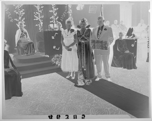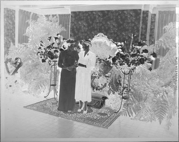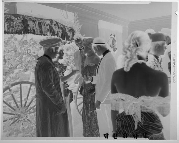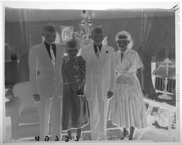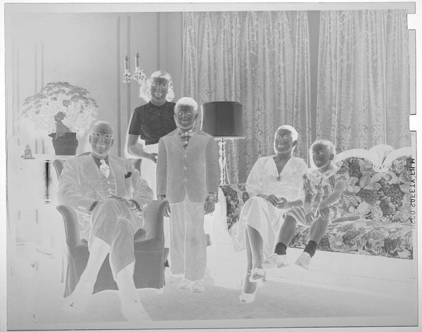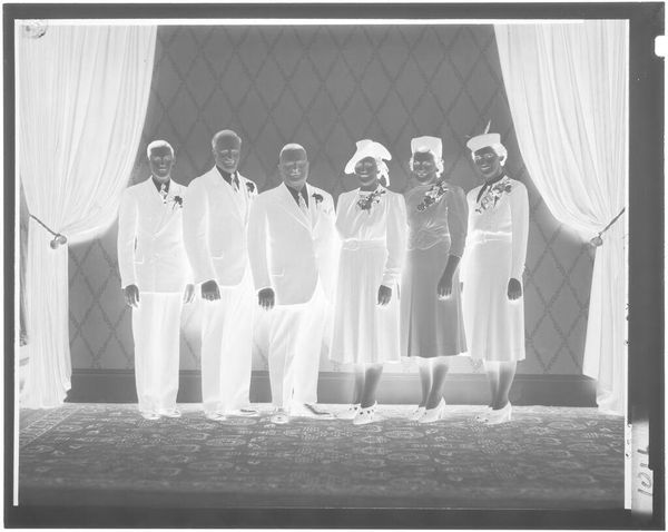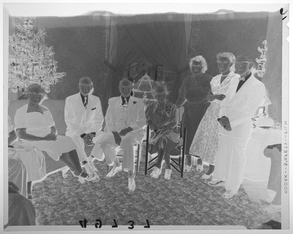 Curator: This striking image, currently untitled and held at the Harvard Art Museums, is attributed to Martin Schweig and features a group portrait of eight individuals in formal attire, staged within what appears to be a reception room adorned with flowers. Editor: It has a haunting quality, doesn't it? The inverted tones and formal poses almost feel spectral, raising questions about representation and memory. Who are these people, and what are they commemorating? Curator: Precisely. Understanding the socio-political context is key. Consider the formal wear, the deliberate arrangement of subjects; these details speak to notions of respectability and aspiration within a specific historical framework, perhaps related to class or status. Editor: And how are those performances of identity complicated by race and gender here? The photograph's very existence challenges the historical exclusion of certain communities from mainstream visual culture. It reframes the narrative. Curator: Exactly. It pushes us to consider the politics of imagery, the public role of art, and how institutions like museums shape our understanding of the past. It provokes thoughts about the legacy that we leave and how future generations will interpret us through the lens of these images. Editor: Ultimately, this image, with all its ambiguity, asks us to confront uncomfortable truths about representation, power, and the stories we choose to tell.