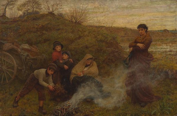 Curator: Laurits Tuxen’s "Boiling Train Oil at Nymindegab, Jutland" from 1879. Just look at this scene—it pulls you right in, doesn't it? Editor: Absolutely. It’s bathed in such a raw light—almost blinding. The first thing that strikes me is how elemental it is. You feel the earth under your feet and can almost smell the boiling oil. Curator: It really does encapsulate a moment, doesn’t it? I see a real blend of something… timeless with the immediacy of life right there on the canvas. Like a fleeting dream. Editor: And the texture! Look how roughly the figures are formed; that material handling! You can imagine how the landscape itself provides all that is needed. Someone's gathering something there, maybe to fuel that fire? Curator: It is intriguing! There is that direct link, isn’t there? I like the ambiguity here. Editor: Tuxen clearly isn’t romanticizing their labor, not one bit! You sense how arduous and critical that action might have been. The thick impasto practically makes the landscape and workers one. I wonder how this piece of production fitted in the context of art consumption in Denmark at the time it was made. Curator: What is the role, eh? Tuxen invites us to witness a scene unfolding...but at the same time we, and these women, are removed from the landscape; and here we are just watching… like peering into someone else’s memory. Editor: Exactly, a painting rooted in process—not just artistic, but the very process of making a living! Think about the materials too. We need wood, hands, vessels; a great many tools in the right place for that oil to boil. And for that labour to have material implication. It is impressive! Curator: It certainly is; it lingers with you after you walk away, wouldn’t you agree? I will come back! Editor: For sure, I'll certainly come back! A good day to you.