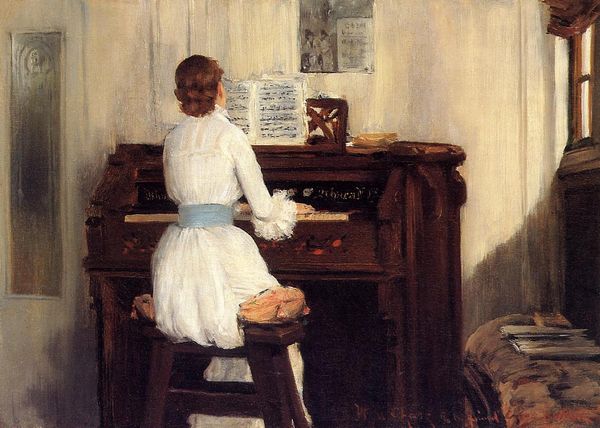 Eva Gonzales painted this intimate scene of a woman at a piano with oils on canvas. What immediately strikes the eye is how Gonzales uses light and shadow to create a sense of depth, the whiteness of her dress set against the stark black piano. The composition is structured around a series of contrasts, of light and dark, focus and blur. The dark stripes across the model's dress and the keys of the piano create a visual rhythm that echoes the musical notations she is playing, and subtly convey an intersection of sight and sound. Gonzales plays with semiotics, the dress itself could be decoded as a signifier of the woman's social status, as clothing denotes social categories. The visible brushstrokes give the scene a sense of immediacy, inviting us to consider the painting not just as a representation but as a physical object. The composition, divided between the sharp focus on the model and the soft ambiguity of the background, challenges our perceptions and engages with the shifting, subjective experience of the modern world.