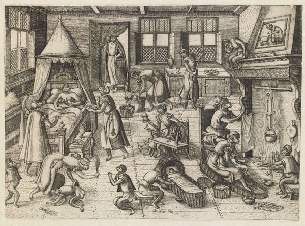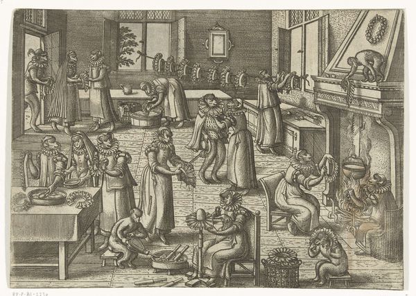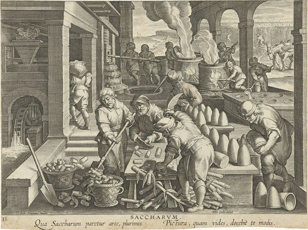 Curator: Ah, this print, “Artilleriewerkplaats” by Philips Galle, dating back to around 1589-1593, always sparks such complex feelings within me. The Rijksmuseum holds it, doesn't it? There’s a certain cold beauty to it. Editor: Yes, and "cold" is a perfect first impression. There's a sense of calculated industry at play. Look at how meticulously rendered each figure is, each action, the sheer labor visible. The wheel mechanism to the left, the menial arrangement of making and casting cannonballs: it really speaks to the industrialization of warfare itself. Curator: Exactly! It’s more than just a workshop scene. It’s an almost alchemical theatre of transformation. Matter is not inert; it is being relentlessly shaped, almost tortured, into these instruments of destruction. I find a strange poetry in the brutal practicality. What appears inorganic takes on, as you say, its life. I'm especially drawn to how close-up it feels; that immediacy draws us into an uncomfortable reality. Editor: Absolutely. It’s about extracting utility and exchange value from raw material—labor into production and that production then into trade and violence. This image feels hyperreal—an emphasis on the social order behind even this kind of early weapons manufacturing. Curator: There's this dance, isn't there, between craft and something deeply unsettling? Do we see this level of material precision as genius and design, or as cold technology divorced from moral intention? The figures almost appear as ants inside an enormous industrial machine—this really underscores my emotional unease viewing it. Editor: That duality resonates so well. Galle highlights how processes rely on human agency, on a multitude of unseen labor activities, yet the effect transcends its origins. These activities begin with fire and then morph into a terrible image of destructive force! Curator: Right! You pinpoint it exactly: a dance from creation to what seems like infernal consumption. Each time I gaze into this detailed print, I question what propels us. Editor: Well put! Ultimately, it's the convergence of intention, matter, and collective undertaking that define these scenes. And isn't it fitting that prints help extend access to the very imagery of labor and violence, transforming consumption as well?