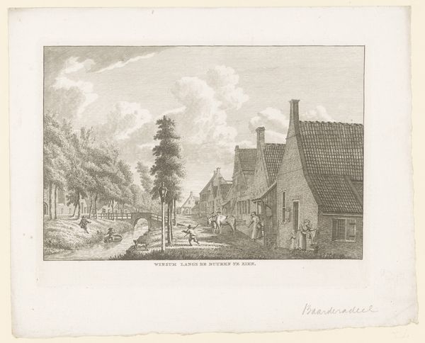 Curator: Before us is "Frozen River by Village," an etching crafted by Andreas Schelfhout sometime between 1837 and 1843. It's part of the Rijksmuseum's collection, offering us a glimpse into a winter scene from the Dutch Golden Age through a print medium. Editor: Ah, it's one of those prints where you feel the cold just by looking at it. I love how the artist captured that grey, muted light you only get on a really icy day. There's something so starkly beautiful about it. Curator: Indeed. Note Schelfhout's masterful manipulation of light and shadow, especially the linear perspective drawing the eye into the frozen expanse, leading it back into the composition toward the barely-visible figures near the frozen waterway. He skillfully articulates the subtle tonal variations achievable through etching, creating depth. Editor: And the textures! You can almost feel the rough thatch of the roofs and the smooth ice under those boats. I imagine Schelfhout really relished capturing the essence of everyday life alongside this bleak landscape. Was he part of some "back to the land" movement of the time, or was it more about painting what he knew? Curator: Schelfhout fits squarely within the landscape tradition, documenting scenes reflecting the period's embrace of Realism with an undercurrent from the romantic landscape that would soon dominate European and North American traditions. His contributions certainly cemented a foundation for those Dutch landscape painters of subsequent generations who further explored their land's unique qualities. Editor: There’s a stillness here that is rather poignant; like everyone is waiting out the cold in quiet determination. It's fascinating how this monochrome print, despite its simplicity, manages to convey such depth of emotion and texture, more than other works done at the time. It's a deceptively powerful scene. Curator: It serves, I think, as a keen testament to Schelfhout’s technical capabilities and nuanced understanding of composition; he has elevated an apparently ordinary scene of landscape into one possessing extraordinary emotional depth through skillful manipulation of line and light. Editor: Absolutely, it’s far more evocative than I initially suspected. The bare trees, the frozen river... suddenly I feel compelled to find some ice skates. Thanks for deepening my appreciation of Schelfhout's eye for beauty!