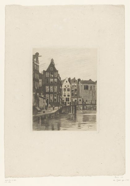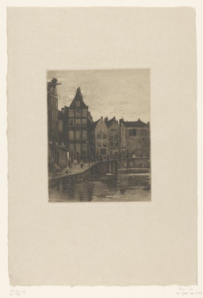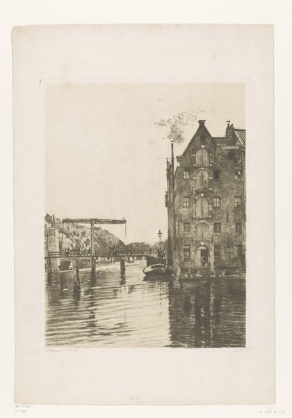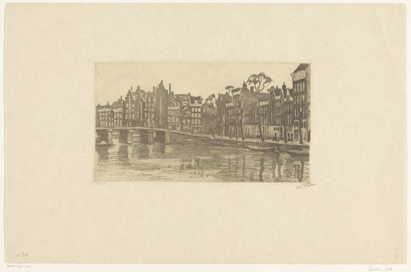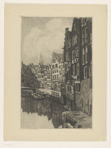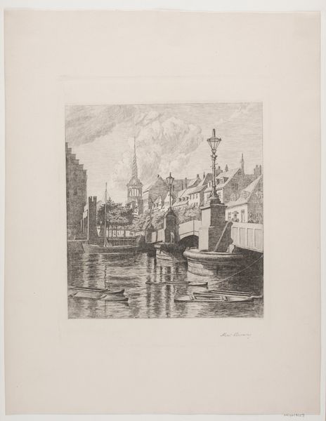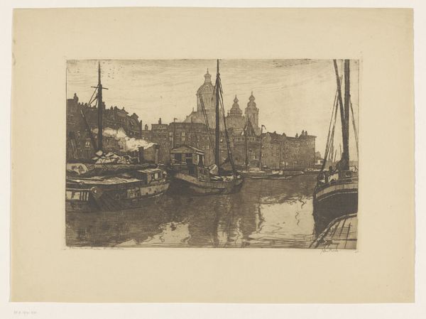 Curator: This etching on paper, "View of the St. Nicholas Church and the Schreier Tower in Amsterdam" by Izaak Leendert Bedding, probably created sometime between 1897 and 1935, offers a glimpse into the city’s soul. Editor: My first impression is one of subdued strength. Despite its monochromatic palette, the artwork exudes an assertive historical presence, standing as a silent testament to Amsterdam's past. Curator: The image pulsates with recognizable forms of faith, commerce, and navigation reflected in the water, binding sacred and profane in a very Dutch synthesis. Consider, too, that the etching medium itself often signified the democratization of imagery. Editor: Absolutely. The strategic inclusion of these architectural symbols fosters narratives concerning societal power structures, like the church, along with Amsterdam’s prominent role in international trade—all framed by the reality of a working waterfront. This image acts as both portrait and commentary. Curator: Indeed, the St. Nicholas Church, dedicated to the patron saint of sailors, echoes the importance of maritime activities. The Schreierstoren—or "Weepers Tower"—resonates too with a deeply emotive meaning, recalling the sorrow of women seeing their loved ones embark on perilous voyages. Editor: And we must consider who controls this visual narrative and what aspects of society they choose to foreground, or perhaps more importantly, leave out. For instance, what might the reflections in the water suggest metaphorically? Curator: Perhaps they mirror the hopes and fears invested in these symbolic structures; they visually bind the terrestrial with the psychic realm. But the choice of a landscape devoid of overt human activity grants primacy to these architectural actors. Editor: Yet their existence implicitly depends upon human enterprise. Ultimately, this artwork captures a moment in Amsterdam’s development. A space of reflection, visually marking the relationship between power, commerce, faith, and the ever-flowing currents of a people's lived reality. Curator: Looking at this etching, I sense a symbolic weight embedded in every stroke. Editor: I’m struck by how a seemingly simple cityscape etching holds such complex layers of meaning.