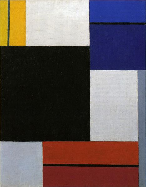 Editor: Today we're looking at Piet Mondrian's "Composition 2," created in 1922. It's an acrylic painting and immediately strikes me with its stark simplicity. How do you interpret this work from a formalist perspective? Curator: Thank you for your keen observation. Let's analyze this piece through its formal qualities, separating it from iconographic meaning. Notice how the deployment of line dictates the overall architecture of the pictorial space. Do you perceive any spatial depth or recessive planes? Editor: Not really, it feels very flat. The thick black lines create a grid, and then the blocks of color – red, blue, yellow – fill some of those rectangles. It’s all very two-dimensional. Curator: Precisely. And that flatness is a crucial aspect of Mondrian's artistic project. Observe the color palette. Can you discern how it contributes to the painting's structure, its balancing act? Editor: Well, the primary colors really pop against all the white. And they're placed asymmetrically, so it avoids being too static, I suppose? Curator: Indeed. The strategic placement avoids absolute symmetry, generating dynamic tension within the rigidly defined space. Semiotically, we could see each intersection as a point of articulation. How might the variable thickness of lines shape the pictorial field? Editor: That’s interesting, I see how that adds another layer. I initially thought it was random but I see the intent of balance. Curator: Indeed, these relationships create both harmony and tension, exemplifying the core tenets of neoplasticism. This dissection of forms yields new dimensions within painting itself. Editor: I see the painting with fresh eyes after understanding the intent for balance by controlling different components of the piece. Thanks for explaining your insights! Curator: My pleasure. This exploration reaffirms that meaning originates not from subject matter, but from the strategic arrangement of visual elements and underlying design grammar.