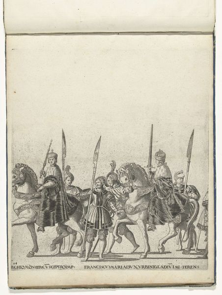 Editor: This is *Herauten, plaat 14* by Nicolaas Hogenberg. It's hard to pinpoint the exact date, somewhere between 1530 and 1620. It looks like an ink drawing, or maybe an engraving. The procession of figures on horseback is so striking! What visual elements do you focus on when you look at this piece? Curator: I am drawn to the linearity and its deployment of chiaroscuro. Observe the parallel hatchings. See how they define form and volume while simultaneously flattening the pictorial space. Consider the interplay between figure and ground. Does the artist intend to represent depth, or are they more interested in pattern and texture? Editor: So you're saying it's less about creating a realistic scene, and more about the formal elements like line and contrast? Curator: Precisely. The subject is almost secondary. We might even ponder the use of line as a means of containment, creating a dialogue between restraint and expressive potential. Do the figures' gestures and expressions contribute to or detract from the formal unity of the composition? Editor: I see what you mean! I was initially caught up in trying to understand who these riders were, but now I notice how the lines create these incredible textures. Curator: Indeed. Furthermore, how might the artist's choice of a monochromatic palette reinforce the emphasis on form and structure? Editor: It’s interesting how stripping away color makes you focus on the shapes themselves. It gives you a different perspective than thinking about the history or narrative being depicted. Thank you for sharing that insight. Curator: The pleasure is mine. Paying attention to the artistic structure can sometimes reveal more than an initial glance at any implied historical narrative.