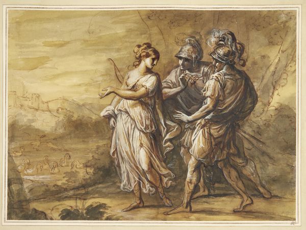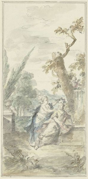 Editor: This is François Gérard's "An Allegory of Empress Josephine as Patroness of the Gardens at Malmaison," circa 1805-1806. The colors are so delicate, almost like a carefully hand-painted postcard. What grabs your attention when you look at this work? Curator: Well, considering its historical moment, the immediate thing I see is not just the romantic portrayal of Josephine, but how Gérard uses the allegory itself as a form of propaganda. Consider the industrial underpinnings necessary for the greenhouses depicted; these are monuments to consumption and a specific social order enabled by industrial materials and processes. Editor: Propaganda through horticulture, interesting! The greenhouse looks enormous, almost like a factory... Curator: Exactly! And the depiction of Josephine in classical garb, placing a wreath on her own bust – it all contributes to the construction of an image. The labor involved in building and maintaining the gardens, sourcing the materials for the building, even the creation of the watercolor itself, all point to systems of power and production. Don’t you find the contrast between the delicacy of the watercolor medium and the grandness of the message quite telling? Editor: I do, especially with the framed birds and fountains to either side, reinforcing control over nature itself as a form of power. How different is this compared to, say, art created using oil painting at that time? Curator: It’s a matter of scale, and perceived value. Watercolors were often seen as studies, less serious endeavors. By using watercolor, Gérard almost domesticates the grand allegory, linking Josephine's patronage with accessible and widely-consumed imagery. It blurs the lines between 'high' art and the consumable world of prints and decor. Editor: That makes so much sense! Thinking about it now, the mass production of prints after this piece allowed it to spread an idealized view of Josephine to a much wider audience. Curator: Precisely. And that widespread image, that’s where its power truly resided. Now, next time you see an idyllic scene, think about the materials, the labor, and the social machinery that brings it into being. Editor: I will definitely see landscapes with new eyes. Thanks for unraveling the many layers embedded within this one!