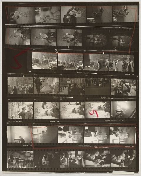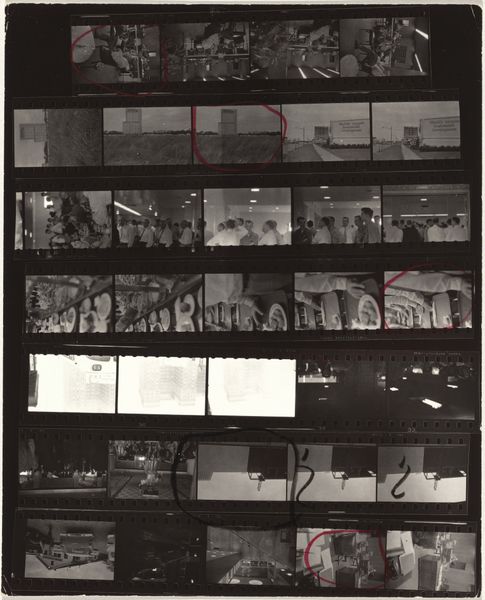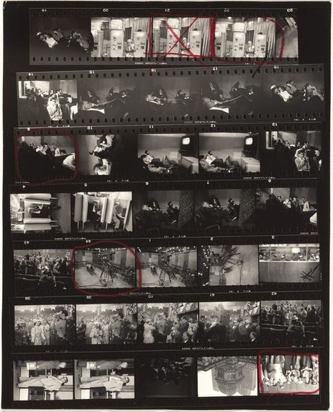 Editor: This is Robert Frank's "Jacqueline Kennedy—Convention 19", a contact print photograph from 1956. Seeing the entire roll like this, I'm struck by the artist's editing choices. What do you see in the sequencing and presentation of these frames? Curator: The immediate visual impact lies in the grid structure itself, the ordered arrangement contrasting with the candid, often chaotic content within each frame. Note how Frank utilizes the negative space between frames to create a rhythm, almost a visual staccato, guiding the eye across the surface. Consider also the materiality—the starkness of the black and white, the raw, unrefined edges of the film strip. These choices foreground the photographic process, reminding us of the artist’s hand. Editor: Right, it feels very intentional, not just a simple display. Why present the entire roll instead of selecting a single 'perfect' shot? Curator: Precisely! By showing us the totality of the shoot, Frank subverts the idea of the decisive moment, the singular image capturing all. The surrounding frames offer context, suggesting alternative possibilities, revealing the artist’s decision-making process. Think of it as a deconstruction of the photographic ideal, revealing its inherent subjectivity. Notice the highlighted frames. What significance do you find in them? Editor: I hadn’t thought of it that way. The marked frames emphasize her presence, literally drawing attention. Does this mean to undermine photojournalism, given its typical association with 'objectivity?' Curator: One could interpret it that way, yes. Frank is not simply documenting; he is engaging in a dialogue about the nature of representation itself. Are we seeing Kennedy, or Frank’s interpretation of her? The highlighted frames force this question upon us. This elevates the work beyond simple photojournalism. Editor: This makes me appreciate how form really impacts meaning. I now see Frank's critique embedded in his method. Thank you! Curator: Indeed. The structural elements serve as more than just presentation. The interplay of form and content is the heart of the matter here.