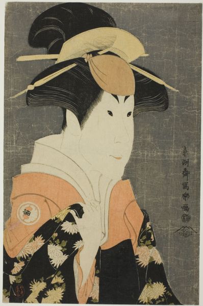 Curator: Welcome. Today we're looking at an Ukiyo-e style woodblock print by Utagawa Toyokuni I, called "The actor Ichikawa Danjuro VI and a boy." The artwork is currently held at The Art Institute of Chicago. Editor: It has an amusing tension; a dynamic of adult formality struggling against a child's impish playfulness. The actor looms, but the kid seems determined to pull him down to earth. Curator: The print utilizes line and form to create visual interest. Note how the strong, dark outlines of the actor's kimono contrast with the softer, patterned clothing of the boy. And the strategic placement of two visible katanas suggesting the identity of the central figure? Brilliant use of semiotics. Editor: Absolutely. This Ukiyo-e provides a window into the social status of actors in the Edo period. Often looked down upon despite their fame, they straddled two worlds. The child clutching at him could be interpreted as representing both the actor’s personal life, as well as his perceived moral standing in broader society. Curator: You raise an interesting point regarding social class and reputation. I'd be interested to know how it informed the artist's conscious decision about perspective in portraying Danjuro VI. Notice, too, how effectively the black of his robe contrasts with the yellows and browns of his pants. It really serves to distinguish them—a key element in deciphering his character in the print. Editor: Also worth examining are the performative aspects of masculinity in Japan at that moment. The stoic, powerful stage presence Danjuro VI cultivates, juxtaposed with the everyday reality of fatherhood or social constraints. It speaks to issues around identity that continue today, regarding gender and artifice. Curator: Precisely. It shows how careful aesthetic consideration can really emphasize layers of historical context. This careful registration, choice of contrasting hues, and dynamic line quality all collaborate to create meaning. Editor: It also demonstrates that even in historical works, relevant contemporary parallels around power dynamics, labor, and social identity may also be explored. A powerful woodblock print to meditate on, indeed.