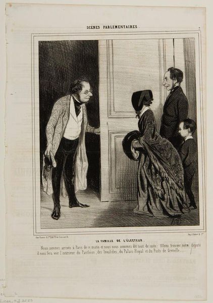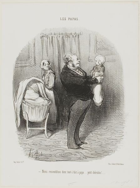 Curator: This is Honoré Daumier's lithograph, "We look exactly like Daddy...little angel!", from his "Les Papas" series. Editor: The stark contrast of light and shadow gives it a rather satirical mood, wouldn't you agree? It's almost grotesque. Curator: Indeed. Note how Daumier uses line to exaggerate the father's features, underscoring the societal pressures on men to reproduce and project their image. Editor: Yes, and how the mother lurks almost hidden in the background. It speaks volumes about the restricted roles of women in that era. The title itself is ironic, pointing to the father's self-obsession. Curator: An astute observation. The composition reinforces these themes of patriarchy and gendered power dynamics. Editor: It certainly provides a critical lens through which to view familial relationships in 19th century France. Curator: A great example of how a lithograph can embody so much social commentary through a simple yet calculated composition.