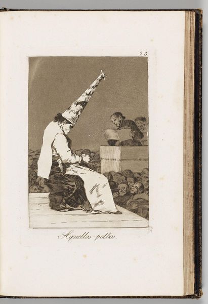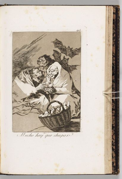 Curator: This etching is titled, “Might Not the Pupil Know More?” by Francisco José de Goya y Lucientes. It’s currently held at the Harvard Art Museums. What’s your initial impression? Editor: It feels like a critique, a very bleak one, of power structures and education. The scale is intimate, but the message seems rather sharp. Curator: Goya uses the donkey as a potent symbol here. The donkey, throughout history, often represents ignorance, stubbornness, and the folly of those in positions of authority. Editor: Absolutely. And seeing the student also as a donkey points towards the cyclical nature of oppression, that the oppressed internalize and then perpetuate the structures. Curator: Yes, Goya’s visual vocabulary here is particularly biting. The mirrors, the ‘A’ on the teaching board…each feels heavy with meaning. Editor: It’s a reminder that true liberation requires questioning the very foundations upon which knowledge and power are built. It’s still relevant, isn’t it? Curator: Indeed. Goya offers a harsh, timeless lesson through this deceptively simple image. Editor: I’ll be pondering this image for some time to come.