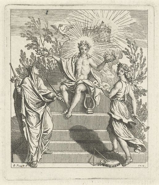 Jacob Folkema created this print, "Roman and Greek Commander Crowned with Laurels", in 1722. The print emerges from a period defined by the Enlightenment's renewed interest in classical antiquity, where ancient Greece and Rome were idealized as cradles of democracy and culture. Here, Folkema presents us with a vision of leadership steeped in the visual language of power. Flanked by classical architecture and crowned by allegorical figures of victory, the commanders stand as paragons of virtue and authority. Yet, these images also prompt reflection on the politics of representation. Who gets remembered as a hero, and whose stories are erased in the march of history? Consider how the print's clean lines and idealized forms reinforce notions of order and control, mirroring the socio-political hierarchies of Folkema's time. This image, while celebrating military achievement, asks us to critically examine the values and power structures it upholds, stirring a dialogue between the past and the present.