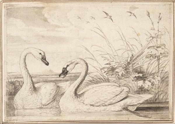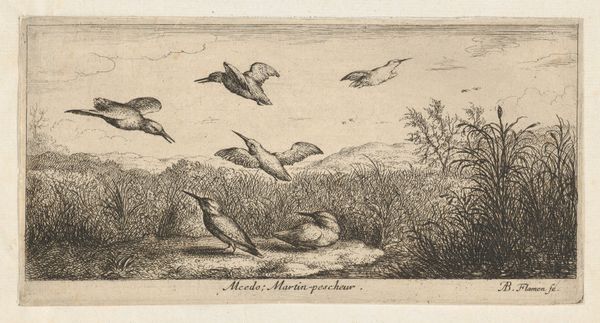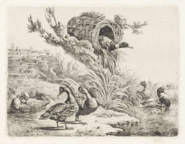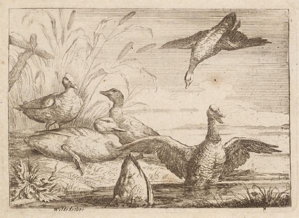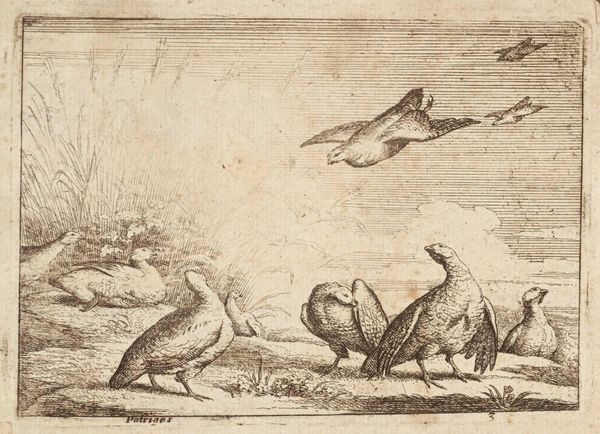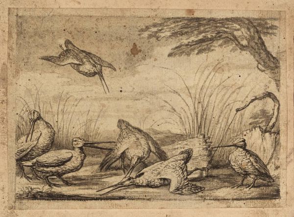 Curator: Francis Barlow’s etching, “Woodecockes,” presents a seemingly simple scene of birds in their habitat. It's currently held in the Tate Collections. Editor: The first thing that strikes me is the texture—the way the etching captures the varied surfaces of the feathers, the rough ground, even the water's surface with these precise lines. Curator: Barlow was renowned for his detailed studies of animals. This piece likely served both artistic and instructional purposes. Consider the role of ornithology during the 17th century, and how such depictions supported emerging scientific classifications. Editor: Right, I'm also thinking about the socio-economic aspects; who would have commissioned or purchased this? The land-owning gentry, maybe, those invested in both the natural world and the leisure of hunting? It speaks to power structures. Curator: Indeed, and perhaps we should think about the means of production. How the copperplate etching itself contributes to the commodification and dissemination of nature. The very act of producing these images reflects early capitalist impulses. Editor: Ultimately, even in this small image, we can see the layers of human relationships with the natural world, the tensions, the power dynamics, and the emerging sciences. Curator: A lot of insights from such a tiny plate of metal.