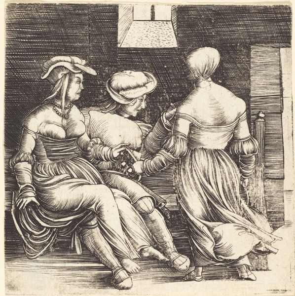 Curator: This small but potent woodcut, titled "The Virgin Seated with the Child," was crafted sometime between 1498 and 1531 by Hans Burgkmair, a significant figure of the Northern Renaissance. Currently, it resides here, at the Metropolitan Museum of Art. Editor: It has a serene, almost stoic feeling. The cross-hatching gives everything a strong linear quality, a sense of firmness. Even in a scene usually filled with soft emotion. Curator: Burgkmair's use of line is quite distinctive. He creates depth and shadow, all the while conveying a quiet domesticity. Editor: The architectural setting almost overshadows them, doesn't it? The columns, the view... It positions them within a constructed, almost staged reality, rather than something natural. Are we meant to consider them ordinary or exalted? Curator: Precisely, the setting balances the divine with the mundane. Notice the book, the flowers, the simple ewer. These are objects of everyday life, but their presence elevates the scene. Think of it as a slice of daily life touched by grace. It mirrors that beautiful and constant tension that is a Northern Renaissance specialty, like in the works of Durer. Editor: It's interesting how contained the Virgin and Child seem despite the open window. The architectural details create a visual frame within a frame. She doesn't feel like she's part of that vista beyond the pillars, rather she's distinctly separate from it. Almost contemplative in her space. Curator: She's a bridge. The composition, particularly the Madonna's positioning between the indoor still life and outdoor scene, certainly echoes this theme. In many ways it also captures this artist's synthesis of Italian Renaissance elements, like perspective, with local aesthetics to form a distinctly German approach. Editor: A fascinating combination indeed. I like this, though it leaves me a bit wistful, perhaps? It's more about presence than exuberance, if that makes sense. Curator: Absolutely, its stillness speaks volumes. For me it’s Burgkmair inviting us to reflect on the intersection of the divine and everyday, using, yes, very precise, economical lines!