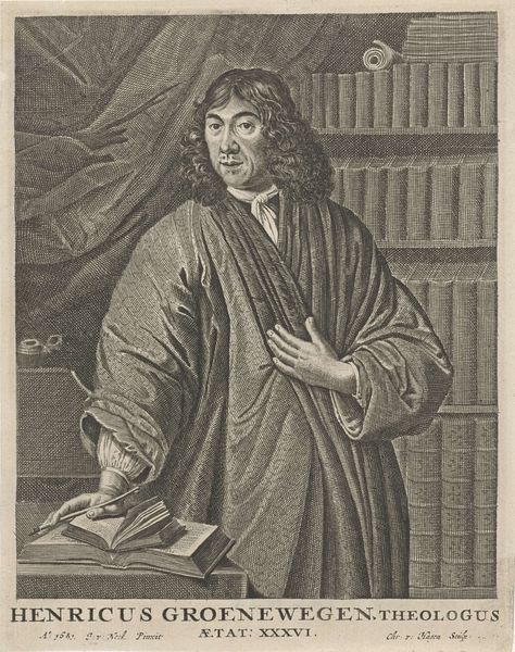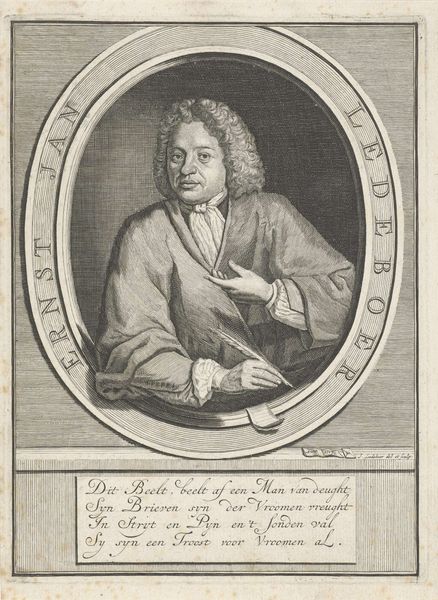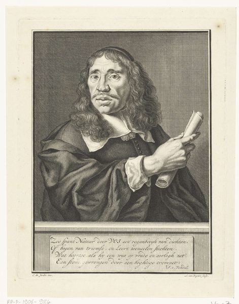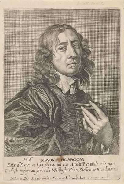 This is Pieter de Jode the Younger’s ‘Portret van Simon Bosboom,’ an engraving now held at the Rijksmuseum. The portrait’s power lies in its use of contrasting textures, especially the juxtaposition of smooth skin against the intricate patterns of hair and clothing. De Jode manipulates light and shadow to create depth, drawing our eye to Bosboom's face and the tools of his trade held in his hand. The composition is structured around a central figure, neatly framed to give a sense of balance and order. Such formal choices reflect the broader artistic and philosophical concerns of the time, specifically how the artist might capture the essence and standing of his subject. Here, Bosboom's intellectual and professional identity is communicated through symbolic props and precise rendering. This approach, of course, is not without its constraints, inviting us to consider whose stories are told and how they are represented within specific cultural codes.