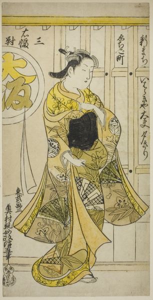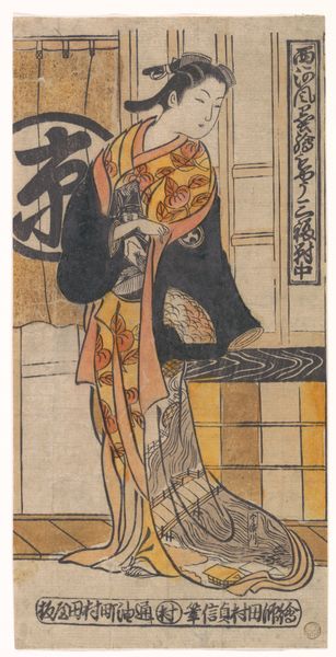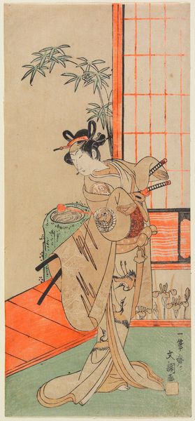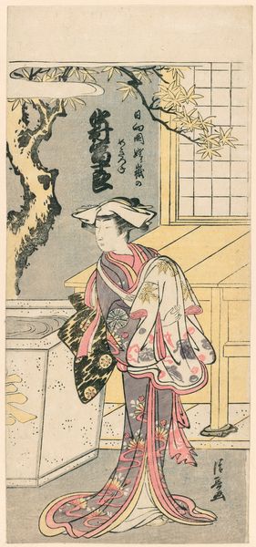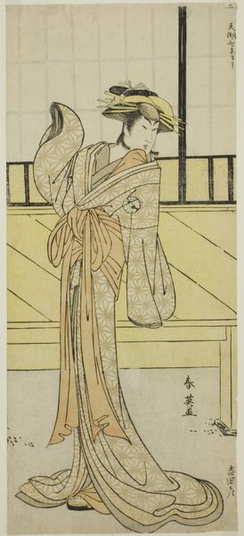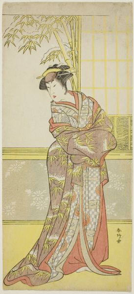 Editor: So, this is Katsukawa Shunko’s print, "The Actor Segawa Kikunojo 3rd in a Female Role," dating from around the 1770s or 1780s. It's an intriguing image and I’m curious to know what story you think this print is trying to tell about Kabuki culture. What do you see here? Curator: Well, it offers a glimpse into the complex socio-political role of Kabuki theatre in Edo period Japan. Ukiyo-e prints like this weren’t just advertisements, but critical documents reflecting and shaping public perception. Shunko, capturing Segawa Kikunojo, is navigating the very charged space of onnagata roles – male actors playing women. Editor: Charged how? Curator: Kabuki was immensely popular, but also carefully regulated by the shogunate. Restrictions on dress, behaviour, even subject matter, were constant. Depictions of actors, especially in female roles, became a way to subtly negotiate those boundaries. This print performs a public function, both celebrating a popular actor, but also hinting at the blurring of gender roles permissible, but only within the accepted, contained space of the theater. The carefully controlled setting within the home emphasizes this point; would you agree? Editor: That's fascinating! I hadn't considered the restrictive political climate influencing something seemingly as simple as an actor portrait. Thinking about that careful framing really shifts how I see this work. Curator: Exactly! It reminds us that art is never created in a vacuum. Appreciating the historical forces at play reveals hidden layers of meaning. Editor: I never looked at art in quite this way before. It's like uncovering a whole other narrative! Curator: Precisely! Now, you will never view an image in the same way, Editor!