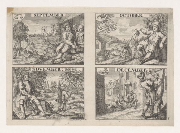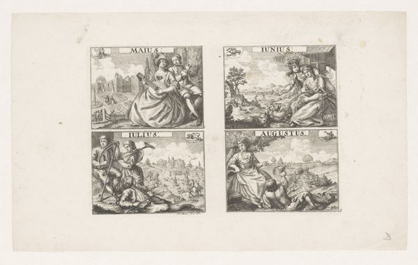 Curator: Let's take a look at this print dating back to the 18th century. It is called "Januari, februari, maart en april" and it was created by Johann Sebastian Müller. Editor: It strikes me as having a charmingly old-fashioned feel. The composition, broken into these four vignettes, gives each month its own distinct character, yet they clearly belong together. Curator: Indeed. This is an engraving on paper and ink. We see a very literal representation of the first four months of the year depicted. In each small panel, a scene from the corresponding month unfolds. Notice how "Januari" portrays people struggling through the snow, while in "Aprilis", we see a celebration of spring and renewal. Editor: Precisely. I'm drawn to how the artist has differentiated each season not just through subject matter but through the compositional arrangements as well. In "Januari," the lines are sharp and stark mirroring the harshness of winter. Compare that to "Aprilis," which uses softer curves and forms to create a sense of ease. Curator: These scenes aren't merely about depicting the weather; they offer glimpses into social life during that period. We see the ways people worked, relaxed, and observed their respective cultures at particular moments. The choice of activities surely reflects prevailing norms of conduct too. The artwork invites reflections about social history and hierarchies during the artist's life. Editor: From my perspective, the strength of the work really is the arrangement and clear organization of each of the boxes. The contrast between heavy, dark lines, particularly noticeable in the “Januari” panel, and the light airiness in "Aprilis" provides a dynamic tension. Curator: And one should also notice the importance of the location of this art: imagine viewing it within the context of a merchant's guild or even at a market, as they would have in the eighteenth century. It offers glimpses into their lives and world views. Editor: So, beyond being an object of aesthetic intrigue, what has this work left me considering? It is the ingenious organization of pictorial elements: I see structure but also expression. Curator: For me, I'm intrigued by how social practices shift and are perceived and framed over time and within changing cultural contexts.