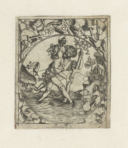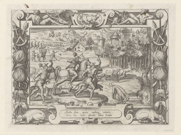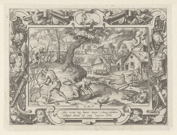 Curator: Let's turn our attention to this engraving by De Vri and Van Stegeren Clement, made sometime between 1816 and 1836. The title, rather poetically, is "Die met Icarus vliegt tot aan de Zonnestralen…," which translates to "He who flies with Icarus to the sun's rays…" quite a mouthful! Editor: Woah, Icarus's definitely having a rough day! Talk about a fall from grace, huh? The black and white etching is stark. It’s dramatic, with that ornate floral border creating this weird sense of separation. Is it commentary? Icarus tumbling while the flowers keep blooming… dark. Curator: It speaks volumes about ambition, and the dangers of overreach. Icarus, defying natural limits, is punished. But note Daedalus beside him; the engraving promotes moderation. He who "maintains the middle path flies safely." A clear moral lesson for the time. Editor: Middle path? Sounds boring! Maybe that's the point. The engraving uses landscape so coolly –the falling man takes up all the space and he is more engaging than the other one who actually is okay. I see this wild energy juxtaposed against total placidity... Is there such thing as bittersweetness or am I reaching too much here? Curator: The composition emphasizes this dichotomy: one figure ascendant, the other plummeting. These prints were intended for wide distribution. The narrative provided visual instruction for social conduct. They used classical stories as moral touchstones to educate, often about caution. Editor: That’s intriguing. And the engravers’ craft! Can you imagine carving all those tiny details, the wings, the town, and that poor horse beneath the flying men?! I find myself dwelling on the process - the careful hand that shaped each line. The discipline and skill really bring this moment to life. It does have you thinking on themes of morality for days, though, now that I noticed, huh? Curator: Precisely. The intention to circulate widely demonstrates print's unique socio-political position. It was meant to reach beyond the art world and influence the common man. To impart messages, and underscore the dominant cultural values of the time. Editor: Alright, alright. Well, I must admit, while I tend to ignore anything "dominant", the art does grow on you after a bit. I see you, engravings, with your quaint look, pushing to instill moderation into the viewer. Mission Accomplished. Curator: A potent reminder, certainly, that images are rarely just images; they are embedded in and reflective of the society that produces them.