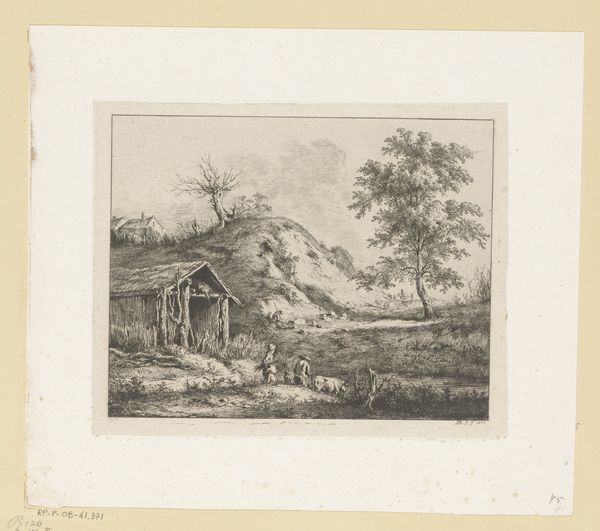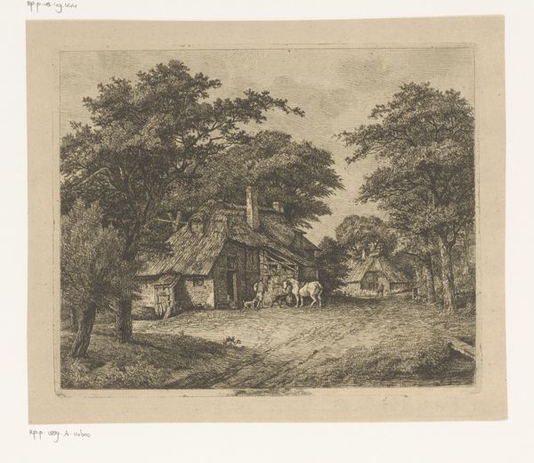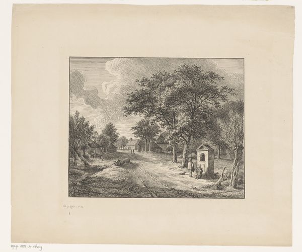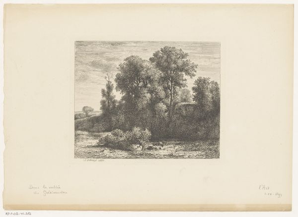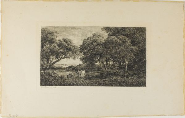 Curator: Let’s turn our attention now to Laurent François Guerdet's "Landscape with a Cleric near a Church," created sometime between 1840 and 1907. It's an etching and engraving, fairly small in scale. Editor: The mood is immediately…somber, isn’t it? That lone figure walking towards the church seems almost swallowed by the trees, the scene etched with such delicate yet stark lines. Curator: The choice of etching and engraving certainly lends itself to that. It was a reproductive medium, allowing for distribution. Were these images made for a mass audience or was it made for the eyes of another artist who had something to learn about the making of line and the build up of tone? Editor: That's a thought. The lines give me the sense of looking at it under a magnifying glass and studying them closely like you suggested. Thinking about the materials involved, the metal plate, the acid, the pressure of the press...there's a physicality to etching that contrasts beautifully with the ethereal quality of the scene. What is more interesting than labor! Curator: Yes, an inherent tension. Look how Guerdet used the line work to depict foliage: dense, almost impenetrable in places, yet delicate and light elsewhere. It’s an interesting juxtaposition, wouldn't you agree? Is the Church looming larger or disappearing depending on how close you come. Editor: Absolutely. And the architecture! That gothic archway has a certain looming quality. It's less about the details and more about the feeling those sharp angles evoke in contrast with the tree line. Curator: Indeed. Perhaps a commentary on the church's presence within the landscape, maybe. We've no context in our time to have had the discussions on the social context between religion and the commoner. It must've been something weighing heavy in their conscious. Editor: Right, which is fascinating given the timeframe Guerdet worked in. This piece captures both an element of historical record and perhaps the feelings in his mind. Curator: Exactly, as we began discussing and concluding on, looking closely at art materials invites the history of culture into its own interpretation! Editor: Very much so, let us go around and perhaps consider this approach again.