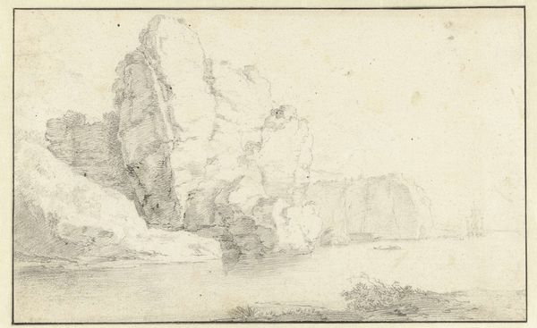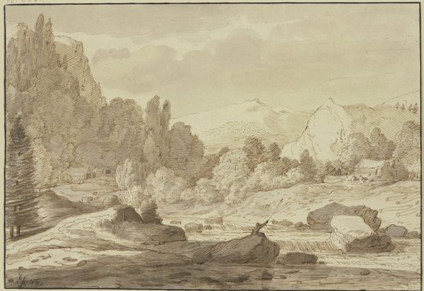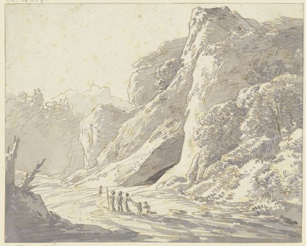 Jacob Esselens made this landscape drawing with pen in the Netherlands in the mid-17th century. At this time, the Dutch Republic was expanding its international trade networks, and Dutch artists were developing new genres of painting like landscape and still life. This drawing shows a somewhat idealized landscape. Notice the minute details of the foliage on the slope, and the tiny buildings nestled in the side of the cliff. In the foreground, three figures appear to be talking. This is a common trope of Dutch landscape painting: the human presence is registered as small and transient in contrast to the grandeur of nature. To understand this drawing, one could research the development of landscape painting in the Netherlands and look at how the genre served the cultural and political project of nation-building.