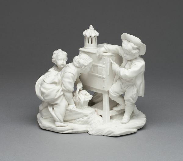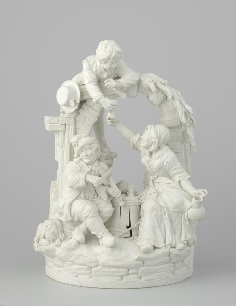 Curator: What a delightful confection! It’s attributed to Niderviller, circa 1760-1800, and it presents “Figure with Amor, putti and fauns” in glazed porcelain. Editor: My first impression is one of theatrical lightness. It's so bright, almost ethereally so, with this kind of baroque frivolity. The composition leads your eye up in a pleasing spiral. Curator: Indeed. This grouping is redolent of Rococo sensibilities – the figures exude a certain carefree indulgence, quite distinct from the somber morality tales depicted earlier. Notice how the faun and the putti are not merely decorative, but deeply intertwined with narratives of love, nature, and earthly delights. Editor: The smooth, almost luminous texture of the porcelain lends itself beautifully to that airy quality. See how the whiteness throws the forms into sharp relief, defining each curl of hair and fold of drapery. It is almost entirely devoid of colour, which keeps the composition from feeling too chaotic. Curator: Yes, and that colourlessness itself is part of the symbolic language. The classical purity of white suggests an idealized vision of innocence, echoing back to earlier ideals. These creatures—fauns representing untamed nature and putti symbolizing divine love—create a layered allegory of human experience. The single figure is Cupid who ties them all together, doesn't he? Editor: Absolutely, he's visually perched right on top of the geometric column, a point of high visual emphasis. This emphasis helps the figures move together. But tell me, beyond pure skill and allegory, do you find this aesthetically successful? All this pristine artifice starts to wear thin, after a while. Curator: Perhaps the surface brilliance overwhelms the darker realities of the world. These themes – erotic innocence and nature's joyful chaos – existed for centuries before and continue to exist around us. These porcelain figures invite the viewer to consider humanity's relation to joy, sexuality, and harmony within their world. Editor: I agree—thinking of it that way certainly makes it more compelling than simply judging on a stylistic level. Curator: A valuable perspective. Editor: Always.