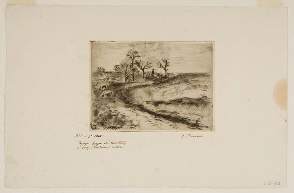Curator: Here we have Camille Corot's "Italian Landscape," an etching residing here at the Harvard Art Museums. What are your initial thoughts? Editor: It's a striking contrast between the foreground and background. The trees are densely packed, almost looming, while the distant sky is soft and open. Curator: Corot was deeply immersed in the Romantic movement; we should recall the public's growing appetite for idealized nature. This print catered to it, didn't it? Editor: Indeed. The composition invites the viewer into a harmonious space but notice how the etched lines articulate every leaf and branch, each contributing to the overall atmospheric effect. Curator: So, through careful technique, Corot shapes not just visual impressions but also the viewer's experience and emotions within this landscape. Editor: Precisely, it's this interplay between form and feeling that makes it so compelling. Curator: It certainly provides a glimpse into the artistic and cultural values of its time. Editor: And through its technique, offers a pathway into understanding form and structure.