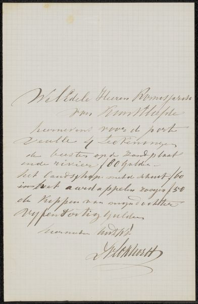 Editor: This is "Brief aan Ary Johannes Lamme," possibly from 1861, created by J.F. van de Laar. It's a drawing in ink on paper, essentially a handwritten letter. I'm struck by how the handwriting itself becomes the artwork. How would you interpret the significance of the letter's visual presentation? Curator: This script offers an intimate glimpse into the writer’s persona. Note the loops and flourishes – they aren't just conveying information, they’re performing identity. The act of hand-lettering itself suggests a certain intentionality, a desire to imprint the message with personal flair, hinting to formality or strong appreciation. Consider how this contrasts with our current reliance on typed communication. Editor: So, it's not just what the letter *says*, but how it *looks* saying it? Curator: Exactly. Each stroke, each carefully crafted letter becomes a symbol. Think of calligraphy in different cultures – how the style conveys status, emotion, and even spiritual significance. What emotional resonance do you pick up from this particular script? Editor: It feels...formal, yet familiar? Like something from a treasured family document. There's also a precision to it, as if Van de Laar carefully composed the whole thing, or had some calligraphic skill? Curator: Indeed, this skilled control strengthens its meaning, a cultivated persona. Perhaps there is even an implicit reference to manuscript culture. So this letter taps into centuries of cultural memory regarding communication and self-representation. Ultimately, it's a poignant example of how even everyday objects can be imbued with deep cultural significance. Editor: That’s a completely new way of seeing a handwritten letter for me! Thank you for opening up that perspective!
