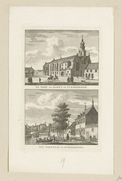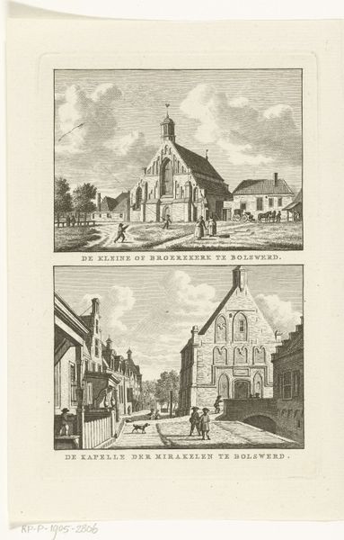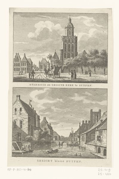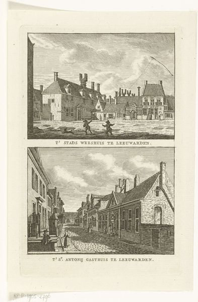 This print, “Twee stadsgezichten te Sneek: Stadhuis en Broerekerk” was made by Carel Frederik Bendorp. The two cityscapes, rendered in monochrome, present a study in contrasting architectural forms and perspectives. The upper scene’s horizontality is anchored by the solid mass of the Stadhuis on the left, drawing the eye along a receding streetscape. A similar spatial recession is visible in the Broerekerk scene below. However, here, the vertical thrust of the church’s spire dominates, creating a dynamic interplay between height and depth. Bendorp masterfully uses linear perspective to convey depth, with buildings and figures diminishing into the distance. This technique, alongside his precise rendering of architectural details, invites the viewer to consider the relationship between the human-made environment and the individuals who inhabit it. Note how these cityscapes also serve as documents, preserving the essence of Sneek's urban landscape.