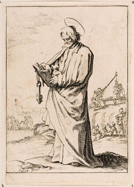 Curator: This is Jacques Callot's "Saint Saturnus," a small etching, measuring only about 7.6 by 4.9 centimeters, currently residing in the Harvard Art Museums. Editor: My initial impression is of stark contrast. There is a dynamic tension between the detailed figure of the saint and the violence unfolding in the background. Curator: Callot's mastery of line is evident here. He uses hatching and cross-hatching to create depth and texture, particularly in the saint's robes, lending them a palpable weight. Editor: I'm drawn to the physicality of the etching process itself. The act of incising the plate, the pressure applied—it all contributes to the stark narrative of faith and persecution. Curator: Indeed. The composition, framed within the oval, directs the eye to the central figure, while the background action provides a narrative context, adding layers of meaning. Editor: Consider the cost of the materials and the time invested. This piece speaks volumes about the role of craftsmanship in disseminating religious iconography. Curator: It's a potent reminder of the power of art to convey complex ideas, even in miniature. Editor: It is, in the end, a testament to the enduring power of material and method to shape meaning.