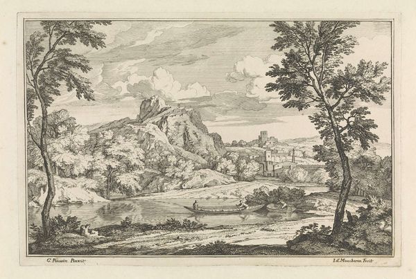 Curator: Here we have Isaac de Moucheron's "Landscape with hills and a tower in the background," an engraving and etching that was likely created sometime between 1697 and 1744. What's your immediate take on this landscape? Editor: Stark. Bleak. Despite the human figures dotted throughout, there’s an overwhelming sense of solitude. All of that detail rendered in blacks and whites and grays reinforces a lack of vibrance. Curator: Indeed. The graphic rendering uses a consistent, controlled line. Note the repetition of shapes—the rounded hills, the foliage. It almost feels…constructed rather than observed. And that tower sits centered in the composition, its geometry providing a stark contrast with the organic forms. Editor: Precisely. This idyllic vista masks deeper, potentially disturbing themes. While pastoral scenes like this seem to champion harmony between humanity and nature, consider that these picturesque estates were built upon systems of resource extraction and stark power imbalances, reflected in even the arrangement of space. Curator: The etching technique lends itself to a layered complexity. The artist plays with depth using varied line weights, creating visual textures within the foliage, the rock formations, and even in the skyscape. It is like the picturesque translated through an almost scientific methodology. Editor: And whose “picturesque” is this anyway? Think about the social function that this artwork performs: the people strolling through seem to merely animate the composition rather than inhabit it. And doesn't this remind you of so many contemporary land disputes or discussions on indigenous representation? The landscape rendered here presents a specific claim that the tower has been placed precisely where it belongs in an orderly way. Curator: A landscape as rhetoric, then? An assertion of visual order… Editor: Exactly! This is a highly cultivated vision of dominion over nature, reflected and bolstered in architectural symbols of control. Curator: A compelling way to contextualize this rather beautiful, albeit austere, image. I’m drawn to the skill used to render nature. You look towards social context and ideological frameworks. It highlights how multifaceted artistic representation really is.