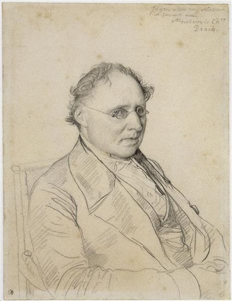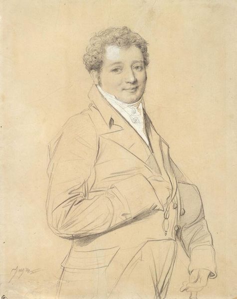 Curator: This is Jean Auguste Dominique Ingres’s portrait of Jean-Pierre Gonin, currently housed at the Harvard Art Museums. Editor: It strikes me as reserved, almost austere. The limited range of graphite on paper evokes a sense of quiet contemplation. Curator: Indeed. Ingres was known for his masterful draftsmanship. This piece highlights his precise control over line and shading. We see how the physical labor results in the depiction of class and refinement. Editor: And it speaks volumes about the social structures of the time. Gonin's confident pose, arms crossed, suggests a man of stature and authority, reflective of the bourgeois values Ingres often depicted. Curator: I think it is important to note the material supports the message, the relative low cost for the medium. It is not just about skill, but access. Editor: I agree. Looking at the paper itself, slightly aged, reminds us of the passage of time and how cultural values shift. It encourages us to question enduring power structures. Curator: A beautiful piece. The artist and the subject together create a fascinating material history. Editor: Absolutely. There are layers of meaning to consider, even within such a seemingly straightforward portrait.